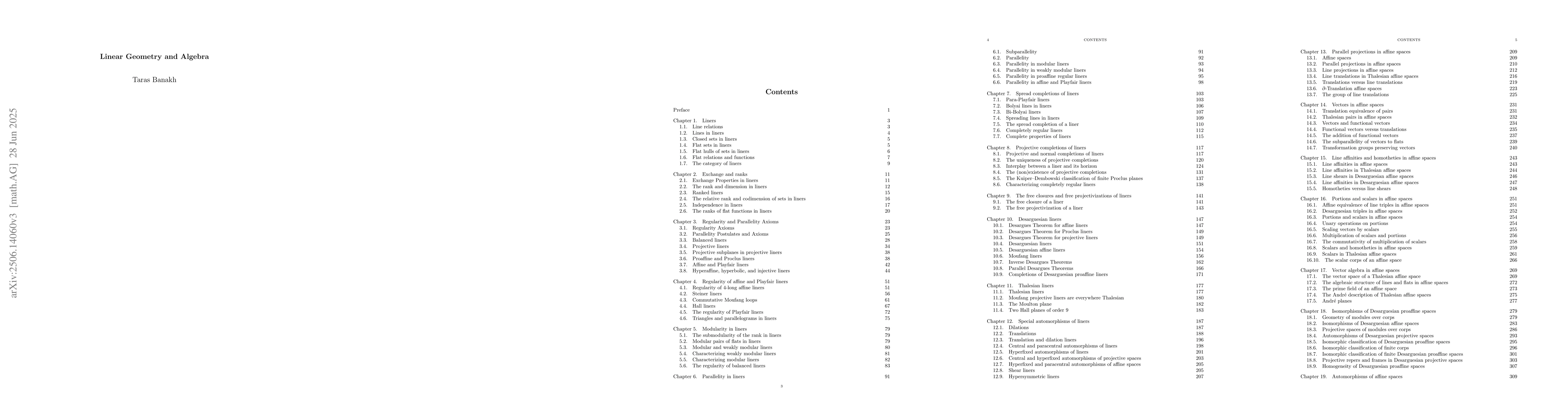 Linear Geometry studies geometric properties which can be expressed via the notion of a line. All information about lines is encoded in a ternary relation called a line relation. A set endowed with a line relation is called a liner. So, Linear Geometry studies liners. Imposing some additional axioms on a liner, we obtain some special classes of liners: regular, projective, affine, proaffine, etc. Linear Geometry includes Affine and Projective Geometries and is a part of Incidence Geometry. The aim of this book is to present a self-contained logical development of Linear Geometry, starting with some intuitive acceptable geometric axioms and ending with algebraic structures that necessarily arise from studying the structure of geometric objects that satisfy those simple and intuitive geometric axioms. We shall meet many quite exotic algebraic structures that arise this way: magmas, loops, ternary-ring, quasi-fields, alternative rings, procorps, profields, etc. We strongly prefer (synthetic) geometric proofs and use tools of analytic geometry only when no purely geometric proof is available. Liner Geometry has been developed by many great mathematicians since times of Antiquity (Thales, Euclides, Proclus, Pappus), through Renaissance (Descartes, Desargues), Early Modernity (Playfair, Gauss, Lobachevski, Bolyai, Poncelet, Steiner, M\"obius), Late Modernity Times (Steinitz, Klein, Hilbert, Moufang, Hessenberg, Jordan, Beltrami, Fano, Gallucci, Veblen, Wedderburn, Lenz, Barlotti) till our contempories (Hartshorne, Hall, Buekenhout, Gleason, Kantor, Doyen, Hubault, Dembowski, Klingenberg, Grundh\"ofer).