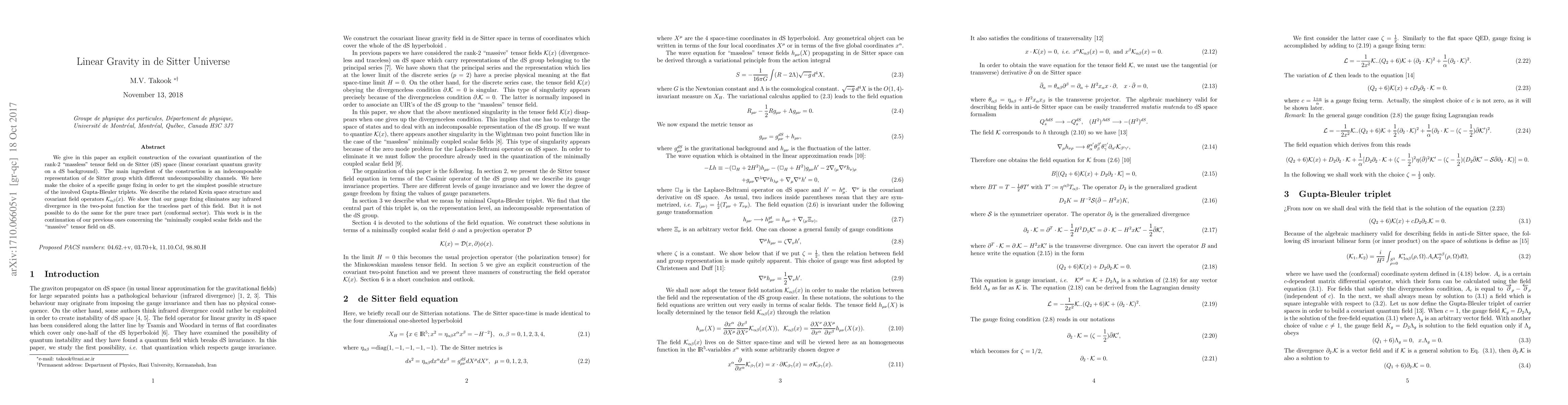 We give in this paper an explicit construction of the covariant quantization of the rank-two massless tensor field on de Sitter space (linear covariant quantum gravity on a de Sitter background). The main ingredient of the construction is an indecomposable representation of de Sitter group. We here make the choice of a specific simple gauge fixing. We show that our gauge fixing eliminates any infrared divergence in the two-point function for the traceless part of this field. But it is not possible to do the same for the pure trace part (conformal sector). We describe the related Krein space structure and covariant field operators. This work is in the continuation of our previous ones concerning the massless minimally coupled scalar fields and the massive tensor field on de Sitter.