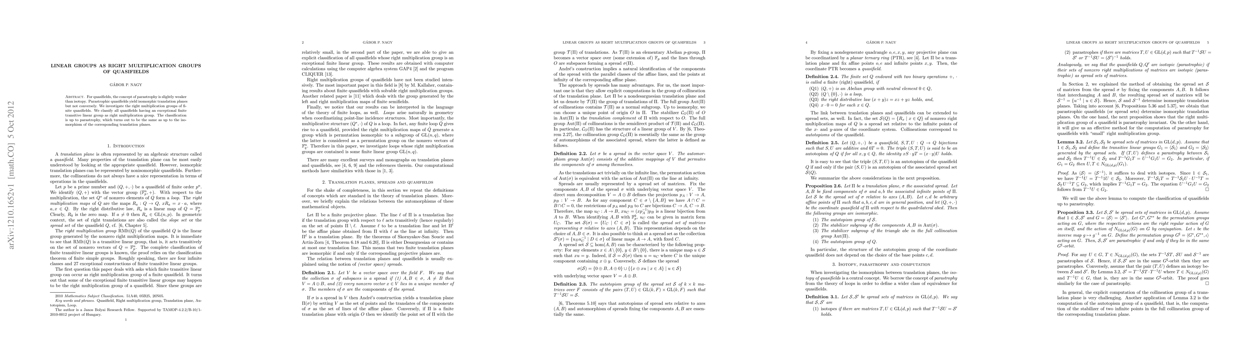 For quasifields, the concept of parastrophy is slightly weaker than isotopy. Parastrophic quasifields yield isomorphic translation planes but not conversely. We investigate the right multiplication groups of finite quasifields. We classify all quasifields having an exceptional finite transitive linear group as right multiplication group. The classification is up to parastrophy, which turns out to be the same as up to the isomorphism of the corresponding translation planes.