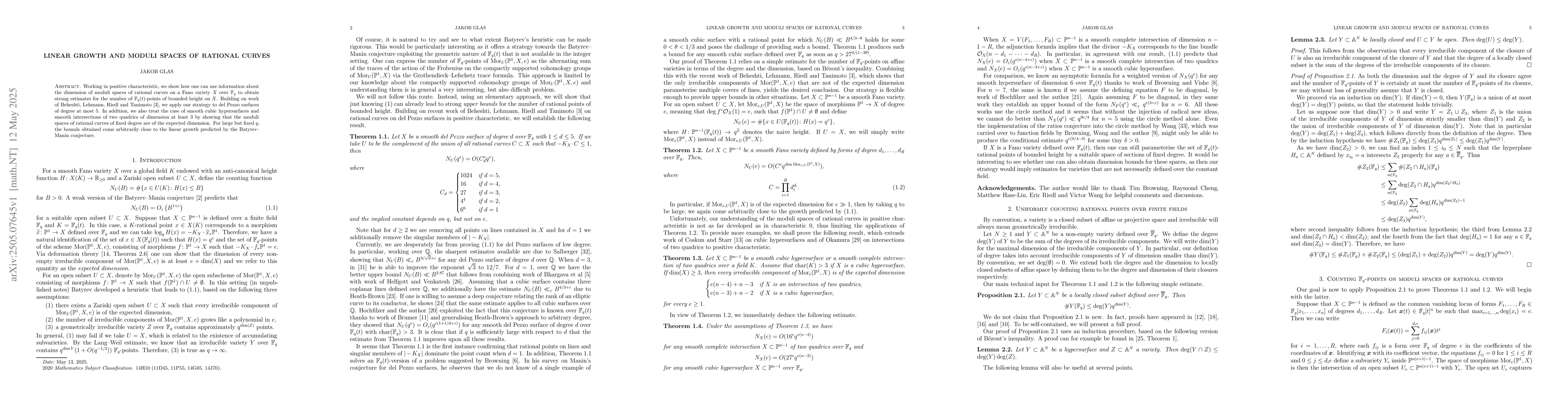 Working in positive characteristic, we show how one can use information about the dimension of moduli spaces of rational curves on a Fano variety $X$ over $\mathbb{F}_q$ to obtain strong estimates for the number of $\mathbb{F}_q(t)$-points of bounded height on $X$. Building on work of Beheshti, Lehmann, Riedl and Tanimoto~\cite{BeheshtiLehmannRiedlTanimoto.dP}, we apply our strategy to del Pezzo surfaces of degree at most 5. In addition, we also treat the case of smooth cubic hypersurfaces and smooth intersections of two quadrics of dimension at least 3 by showing that the moduli spaces of rational curves of fixed degree are of the expected dimension. For large but fixed $q$, the bounds obtained come arbitrarily close to the linear growth predicted by the Batyrev--Manin conjecture.