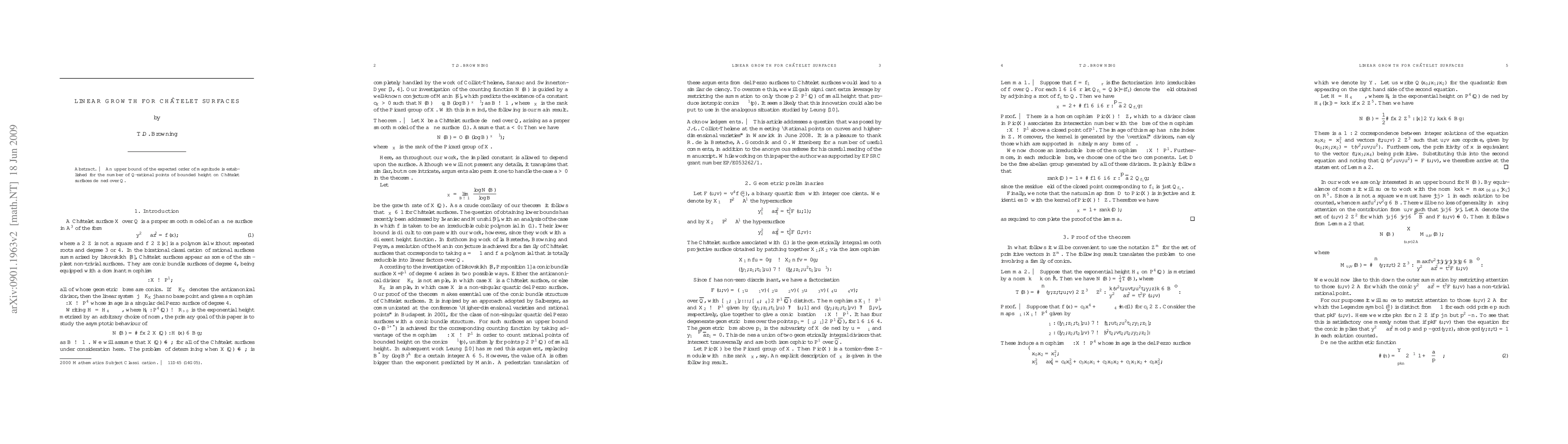 The research establishes an upper bound for the number of rational points of bounded height on Châtelet surfaces defined over the rationals, utilizing a family of conics and the exponential height H4 on P4(Q) metrized by a norm ‖·‖ on R5.