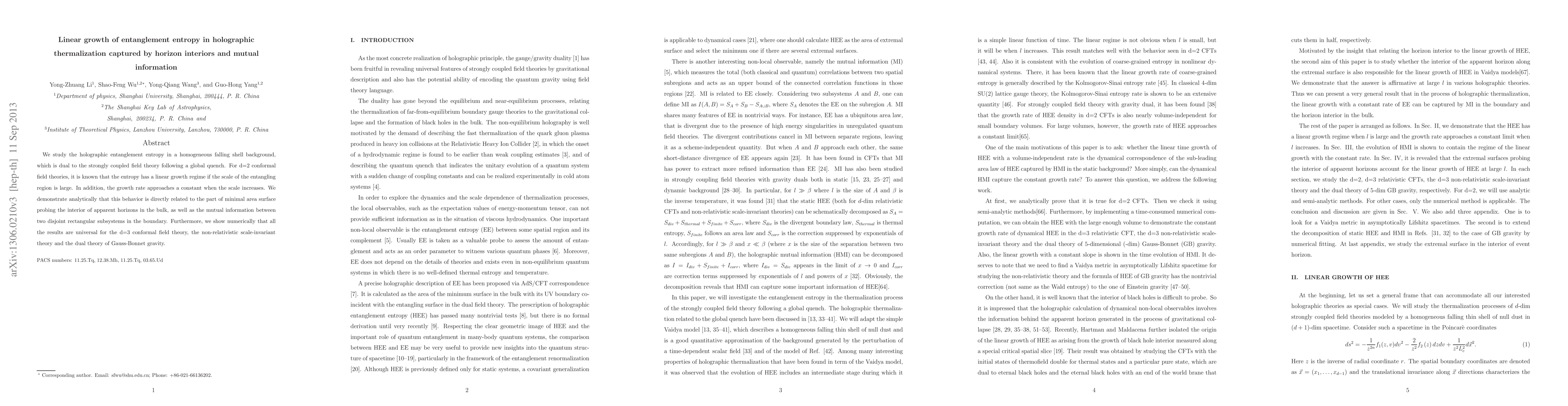 This research analytically and numerically shows that the linear growth of entanglement entropy in holographic thermalization is linked to minimal area surfaces in apparent horizon interiors and mutual information in boundary subsystems. This universality is demonstrated for various dimensional conformal field theories and theories dual to Gauss-Bonnet gravity.
