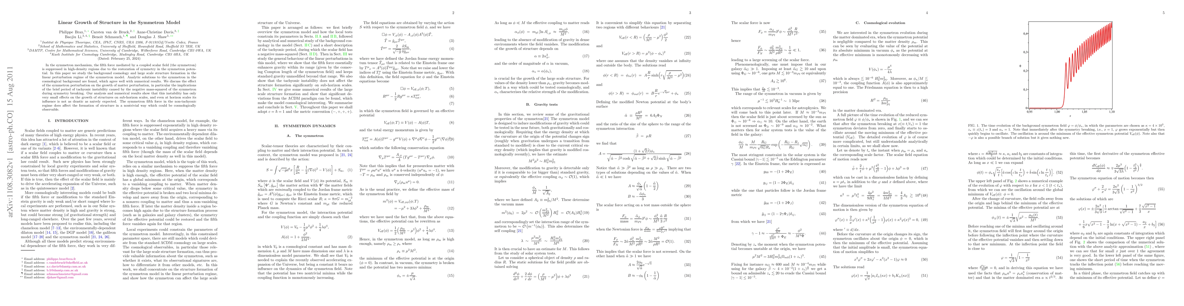 This paper investigates the linear growth of structure in the symmetron model, where a fifth force mediated by a coupled scalar field is suppressed in high-density regions. The study finds that the brief tachyonic instability during symmetry breaking has minimal impact on structure growth, while the symmetron fifth force in the non-tachyonic regime could have observable effects on large-scale structure formation.