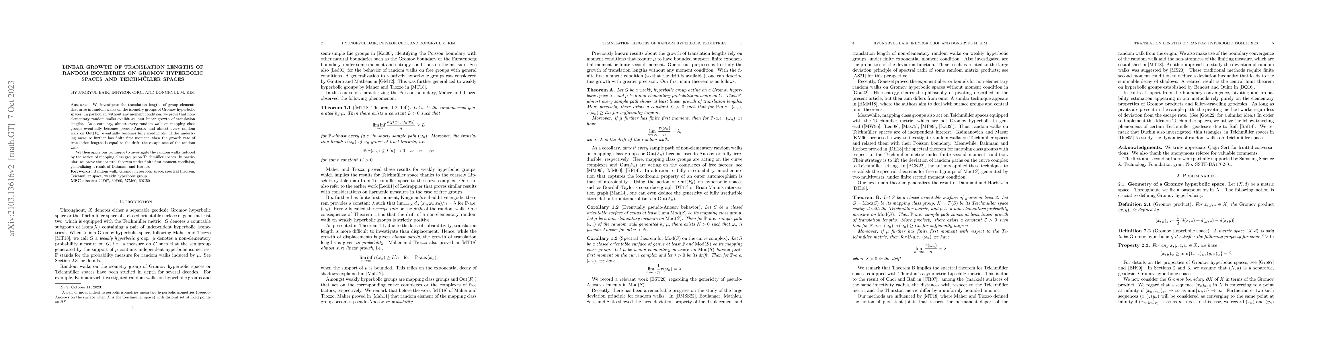 This paper proves that non-elementary random walks on isometry groups of Gromov hyperbolic spaces exhibit linear growth in translation lengths, leading to almost every random walk becoming pseudo-Anosov or fully irreducible. It also extends these results to random walks on mapping class groups acting on Teichmüller spaces, proving a spectral theorem under a finite first moment condition.