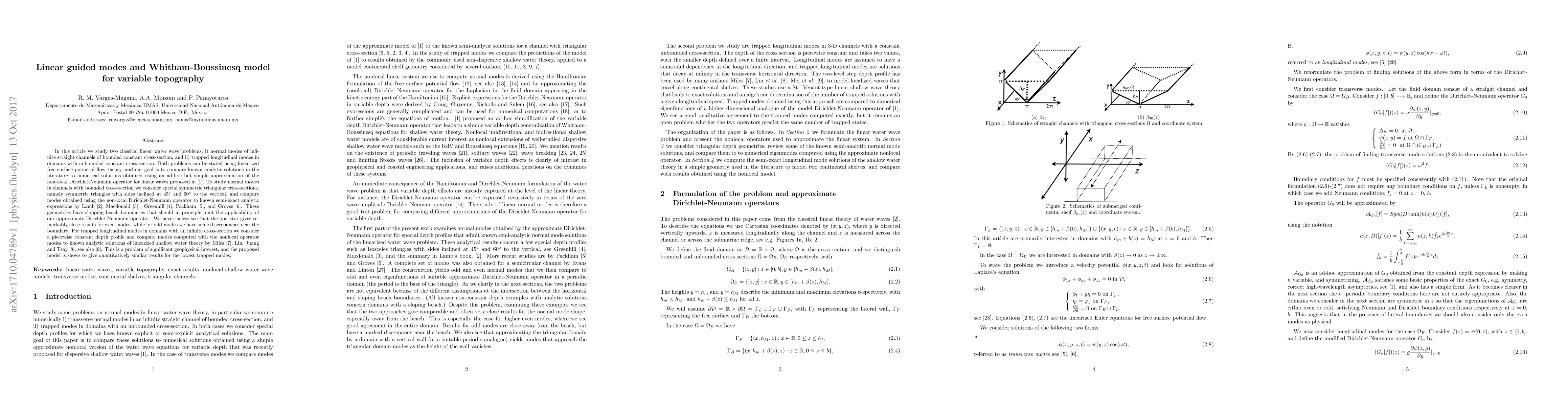 In this article we study two classical linear water wave problems, i) normal modes of infinite straight channels of bounded constant cross-section, and ii) trapped longitudinal modes in domains with unbounded constant cross-section. Both problems can be stated using linearized free surface potential flow theory, and our goal is to compare known analytic solutions in the literature to numerical solutions obtained using an ad-hoc but simple approximation of the non-local Dirichlet-Neumann operator for linear waves proposed in [vargas2016whitham]. To study normal modes in channels with bounded cross-section we consider special symmetric triangular cross-sections, namely symmetric triangles with sides inclined at $45^{\circ}$ and $60^{\circ}$ to the vertical, and compare modes obtained using the non-local Dirichlet-Neumann operator to known semi-exact analytic expressions by Lamb [lamb1932hydrodynamics], Macdonald [macdonald1893waves] , Greenhill [greenhill1887wave], Packham [packham1980small], and Groves [groves1994hamiltonian]. These geometries have slopping beach boundaries that should in principle limit the applicability of our approximate Dirichlet-Neumann operator. We nevertheless see that the operator gives remarkably close results for even modes, while for odd modes we have some discrepancies near the boundary. For trapped longitudinal modes in domains with an infinite cross-section we consider a piecewise constant depth profile and compare modes computed with the nonlocal operator modes to known analytic solutions of linearized shallow water theory by Miles [miles1972wave], Lin, Juang and Tsay [lin2001anomalous], see also [mei2005theory]. This is a problem of significant geophysical interest, and the proposed model is shows to give quantitatively similar results for the lowest trapped modes.