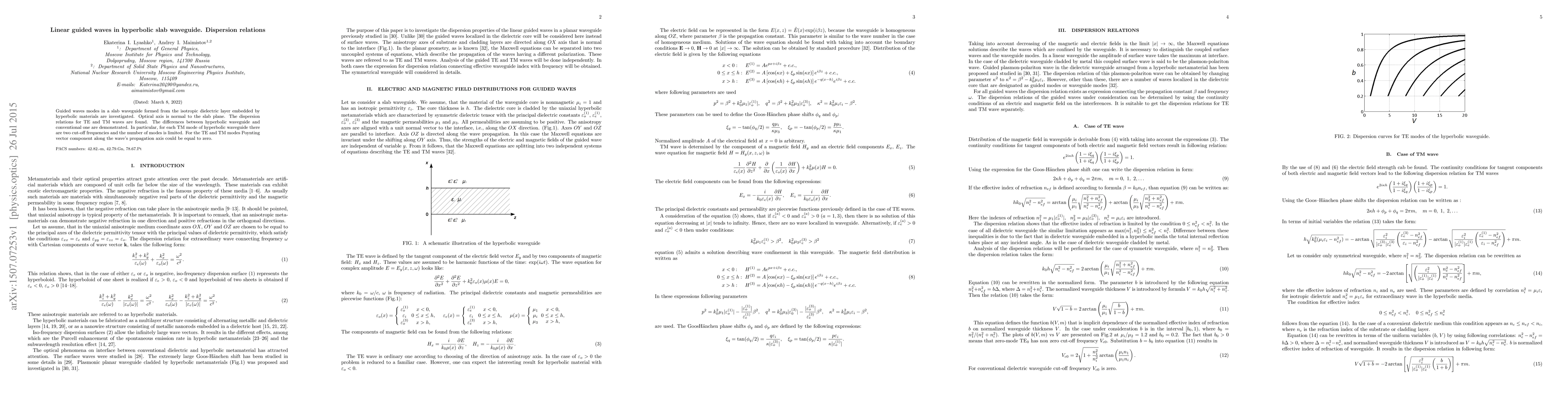 This paper investigates guided wave modes in a slab waveguide composed of an isotropic dielectric layer sandwiched between hyperbolic materials, finding unique dispersion relations for TE and TM waves. It highlights that hyperbolic waveguides exhibit distinct characteristics, such as two cut-off frequencies per TM mode and a limited number of modes, contrasting with conventional waveguides.