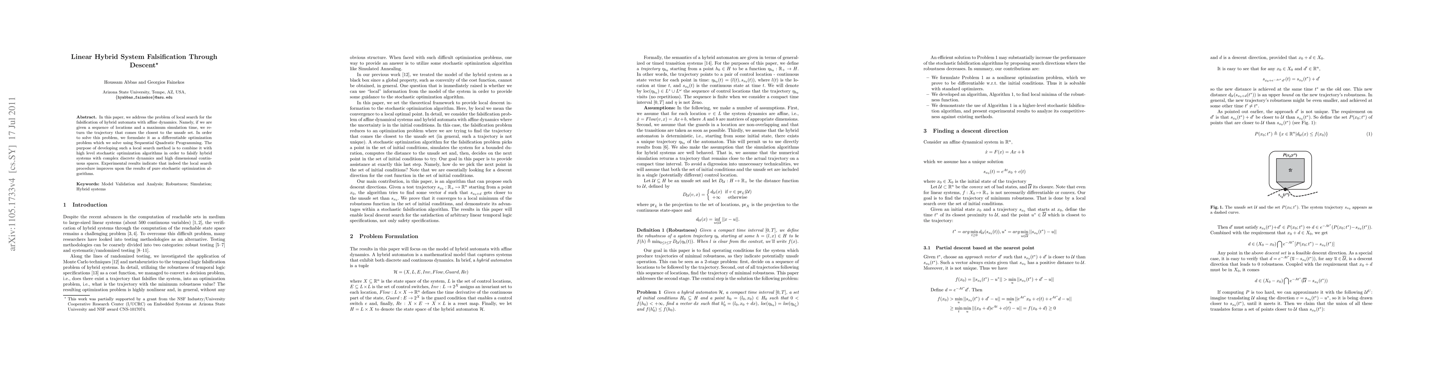 The paper presents a method for falsification of hybrid automata with affine dynamics using a differentiable optimization problem solved via Sequential Quadratic Programming (SQP). The approach aims to improve upon stochastic optimization algorithms for systems with complex discrete dynamics and high-dimensional continuous spaces.