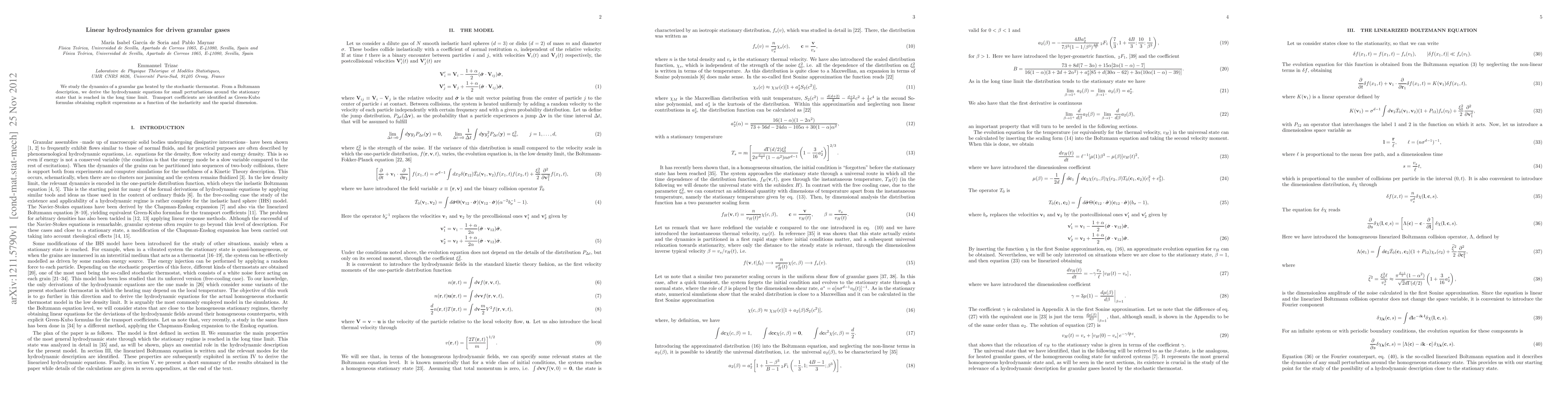 We study the dynamics of a granular gas heated by the stochastic thermostat. From a Boltzmann description, we derive the hydrodynamic equations for small perturbations around the stationary state that is reached in the long time limit. Transport coefficients are identified as Green-Kubo formulas obtaining explicit expressions as a function of the inelasticity and the spacial dimension.