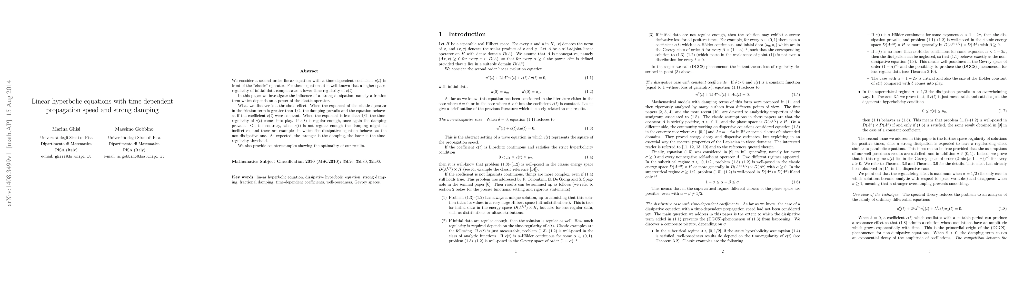 This paper examines a second-order linear hyperbolic equation with a time-dependent coefficient and strong damping, revealing a threshold effect based on the damping exponent. When the damping exponent exceeds 1/2, the equation behaves as if the coefficient were constant, while lower exponents highlight the role of the coefficient's regularity.