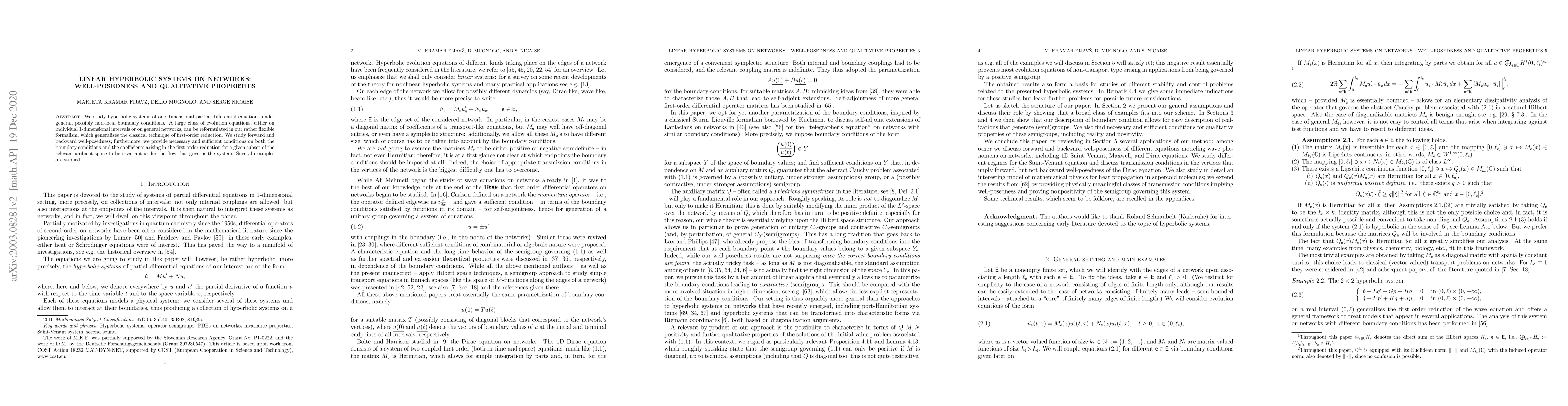 This research explores hyperbolic systems of one-dimensional PDEs with flexible boundary conditions on networks. It presents a generalized first-order reduction technique, examines system well-posedness, and identifies conditions for invariant subsets under system flow. Examples illustrate the methodology.