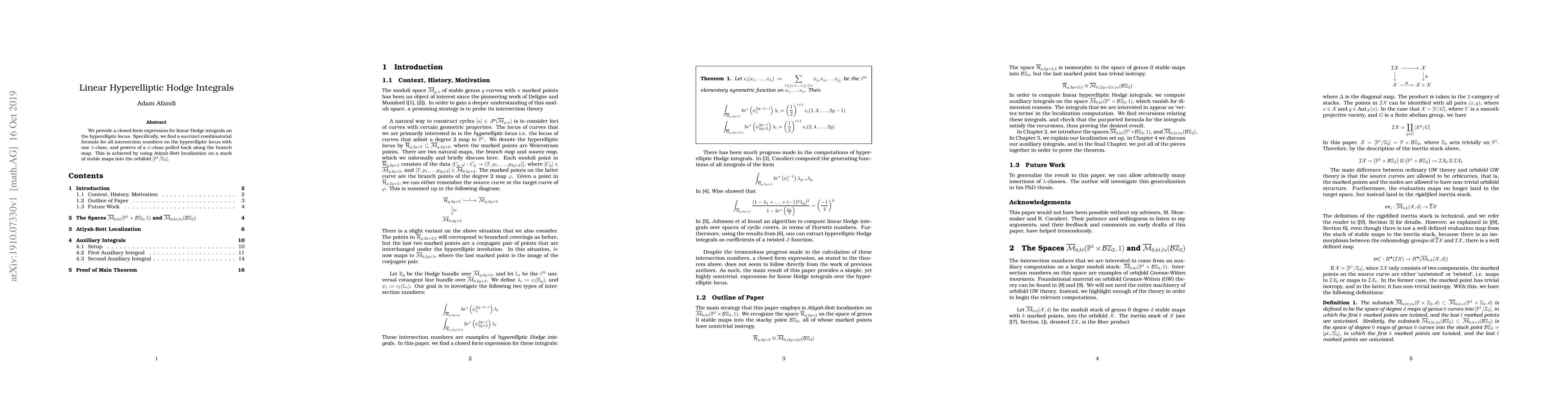 This paper presents a closed-form expression for linear Hodge integrals on the hyperelliptic locus through Atiyah-Bott localization on a stack of stable maps into the orbifold $[\mathbb{P}^1/\mathbb{Z}_2]$, yielding a combinatorial formula for intersection numbers involving $\lambda$-classes and powers of $\psi$-classes.