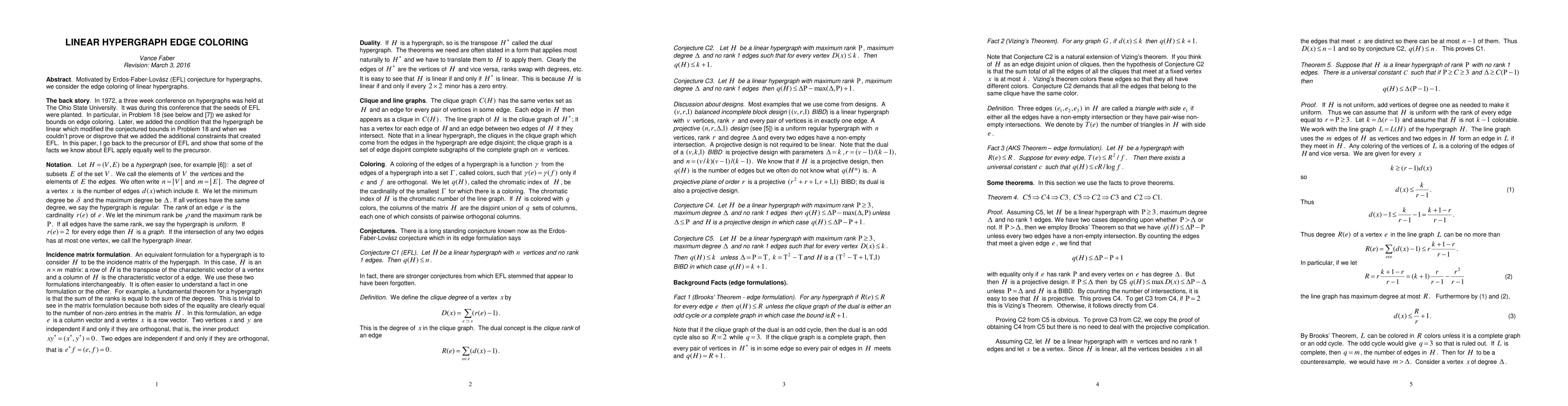 This paper investigates conjectures related to edge coloring in linear hypergraphs, particularly advancing the Erdos-Faber-Lovasz conjecture for a broader class of hypergraphs. The results extend the validity of EFL beyond previously established limits.