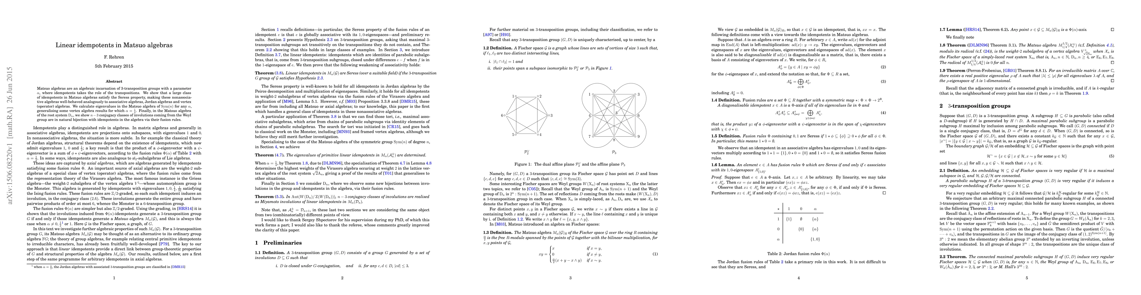 This paper investigates linear idempotents in Matsuo algebras, demonstrating that many idempotents satisfy the Seress property, akin to associative and Jordan algebras. It also calculates eigenvalues in the Matsuo algebra of ${\rm Sym}(n)$ for any $\alpha$, and shows a natural bijection between involutions from the Weyl group and idempotents in the Matsuo algebra of ${\rm D}_n$.