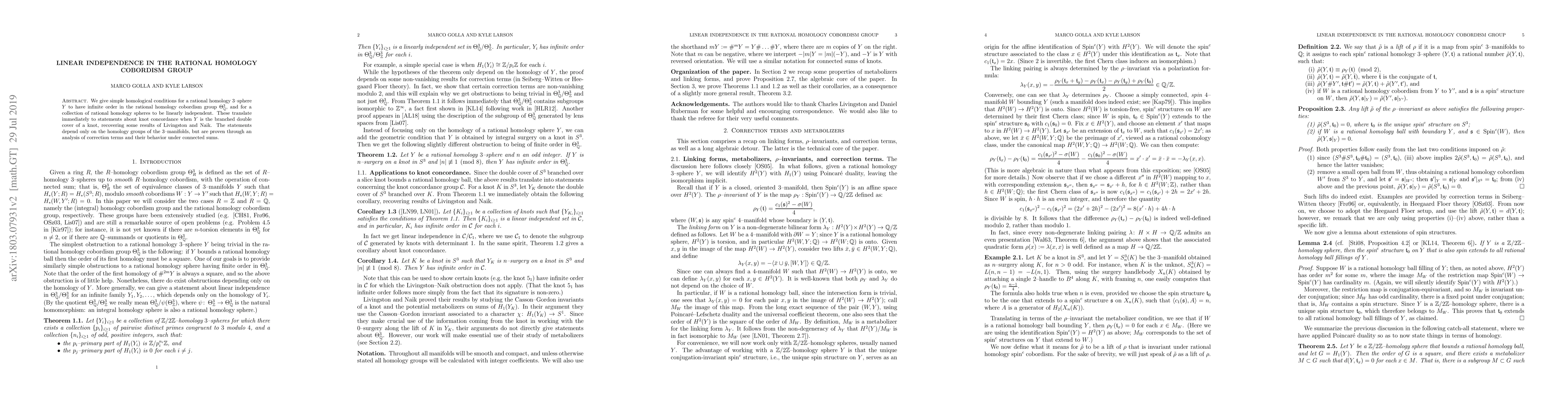 This paper provides homological criteria for determining if a rational homology 3-sphere has infinite order in the rational homology cobordism group and establishes linear independence among collections of such spheres. The results apply to knot concordance, extending findings by Livingston and Naik.