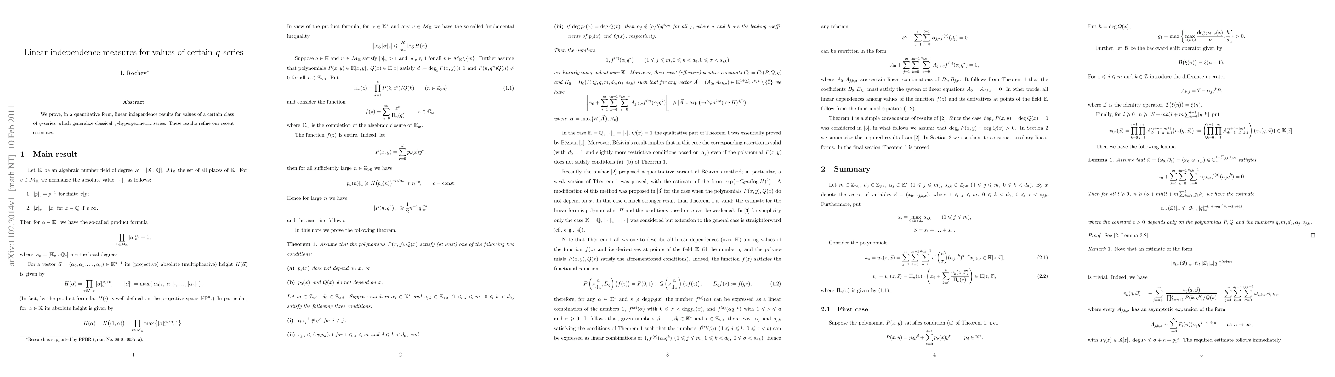 Summary: This paper quantifies linear independence for values of a generalized class of q-series, refining previous estimates and extending classical q-hypergeometric series. The findings provide new insights into the structure of these mathematical objects.