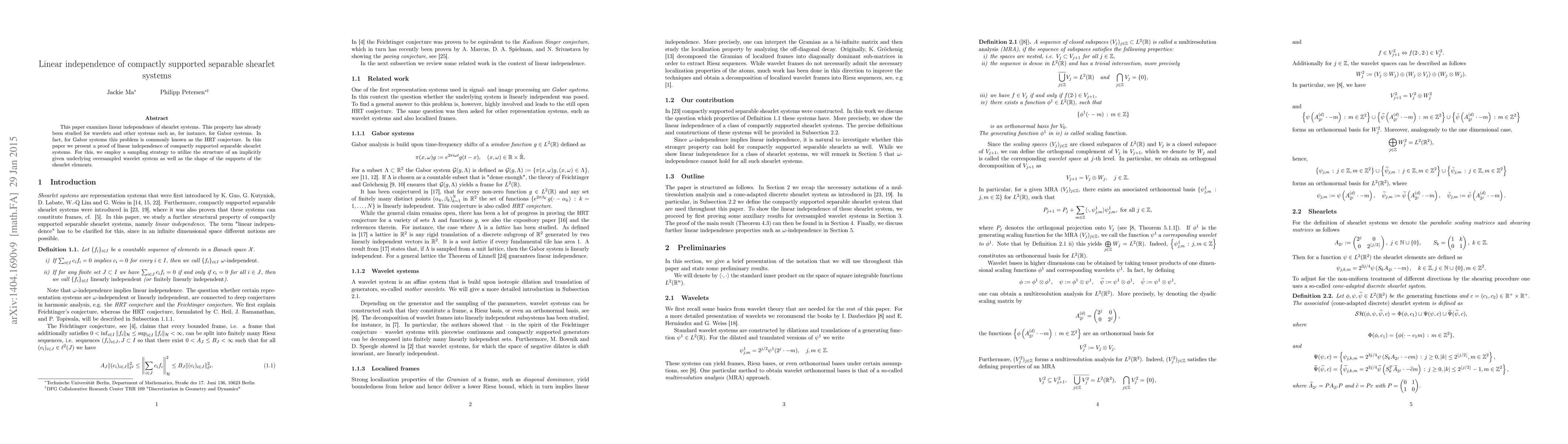 This paper examines linear independence of shearlet systems. This property has already been studied for wavelets and other systems such as, for instance, for Gabor systems. In fact, for Gabor systems this problem is commonly known as the HRT conjecture. In this paper we present a proof of linear independence of compactly supported separable shearlet systems. For this, we employ a sampling strategy to utilize the structure of an implicitly given underlying oversampled wavelet system as well as the shape of the supports of the shearlet elements.