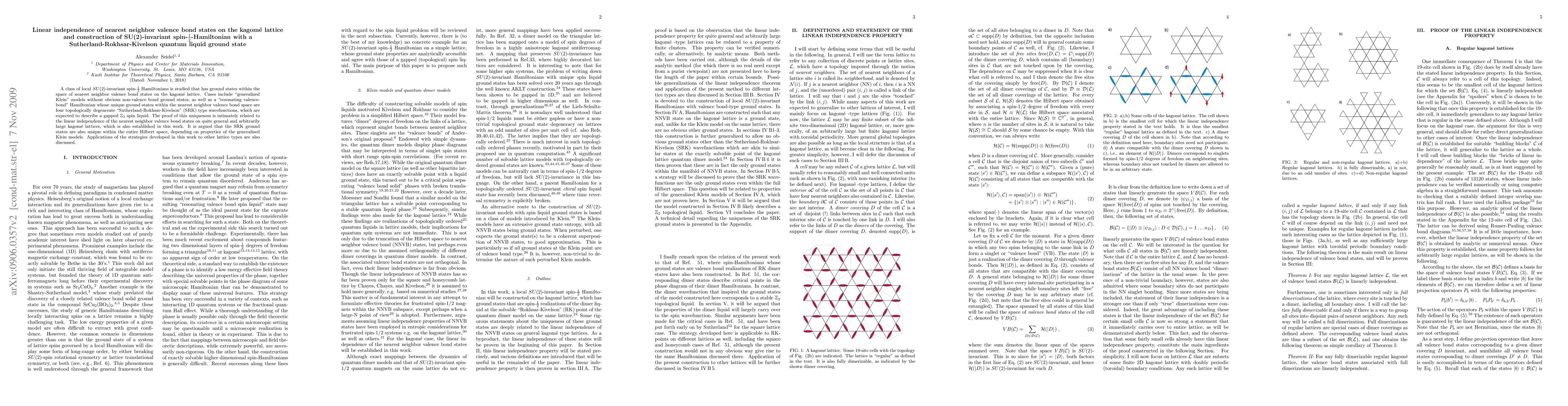 This paper investigates SU(2)-invariant spin-1/2 Hamiltonians on the kagome lattice, proving the linear independence of nearest neighbor valence bond states and establishing the uniqueness of Sutherland-Rokhsar-Kivelson (SRK) ground states within this space, which describe a gapped $\mathbb{Z}_2$ spin liquid.