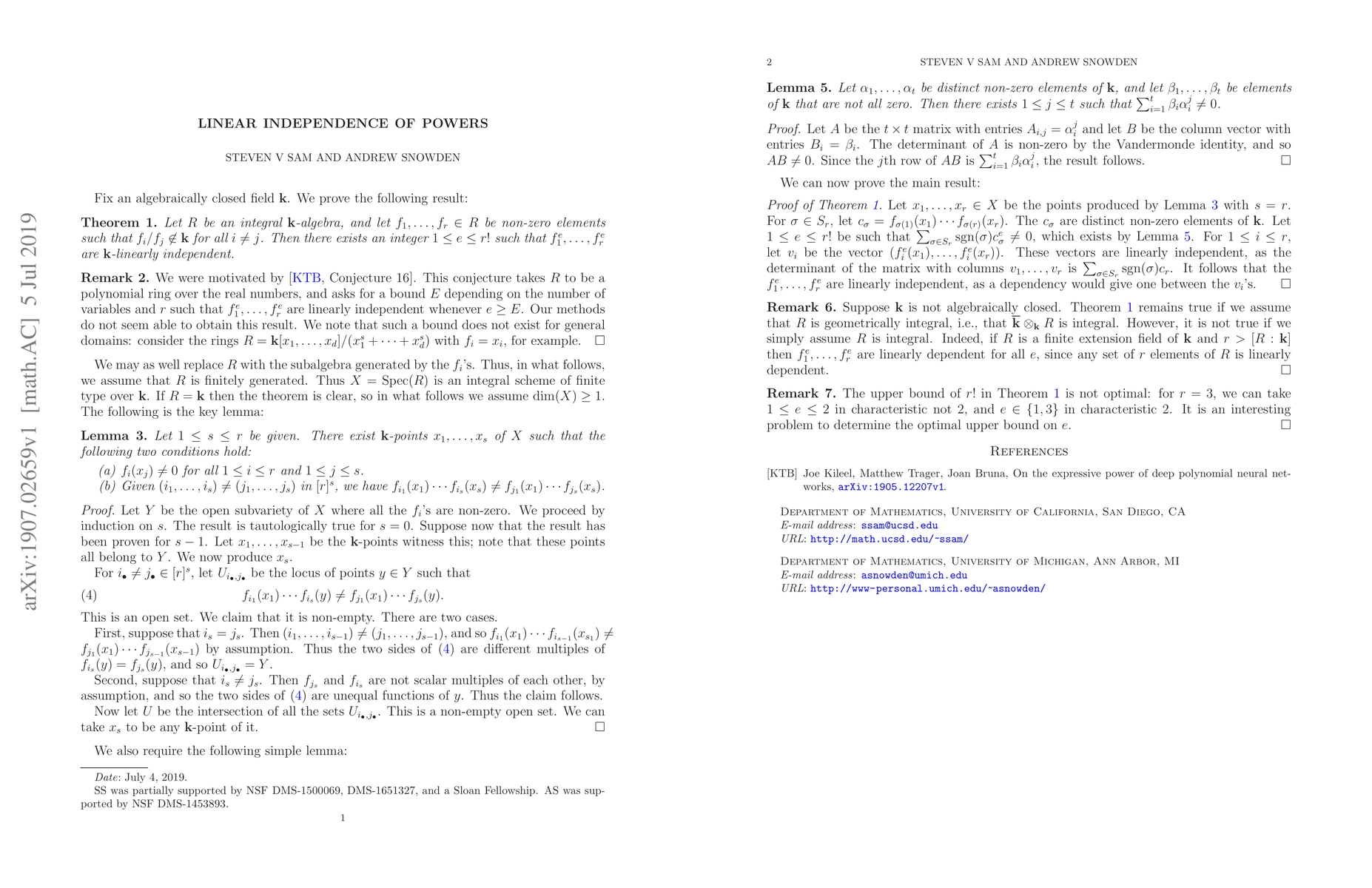 Given r elements in an integral domain over an algebraically closed field such that any two are linearly independent, we show that there is an integer e between 1 and r! such the eth powers of these elements are linearly independent.