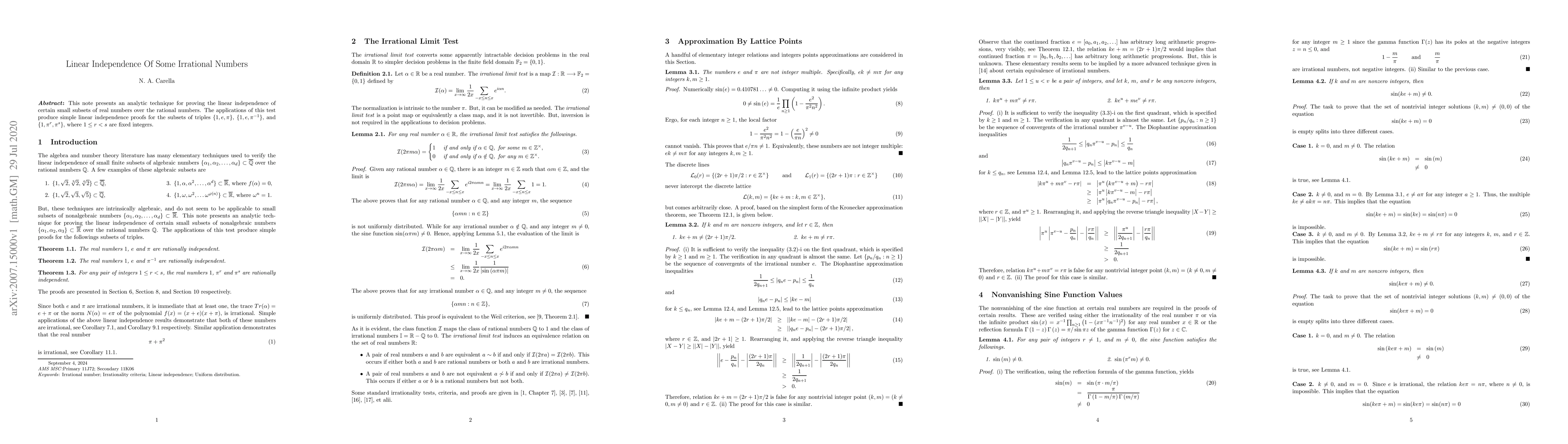 This paper introduces an analytic technique to prove linear independence of certain irrational numbers over rational numbers for subsets like {1, e, pi} and {1, pi^r, pi^s}. It provides simple proofs for the linear independence of these subsets using this method.
