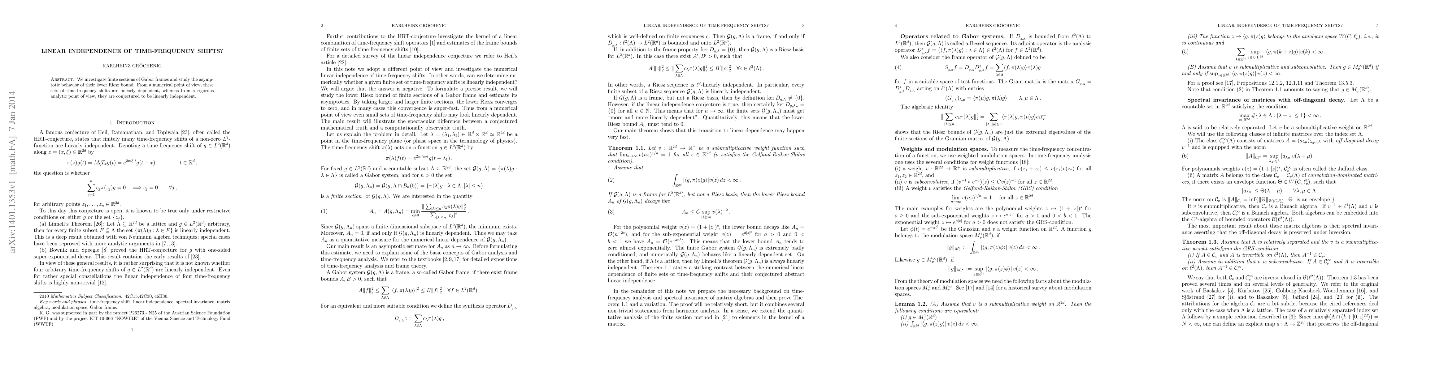 We investigate finite sections of Gabor frames and study the asymptotic behavior of their lower Riesz bound. From a numerical point of view, these sets of time-frequency shifts are linearly dependent, whereas from a rigorous analytic point of view, they are conjectured to be linearly independent.