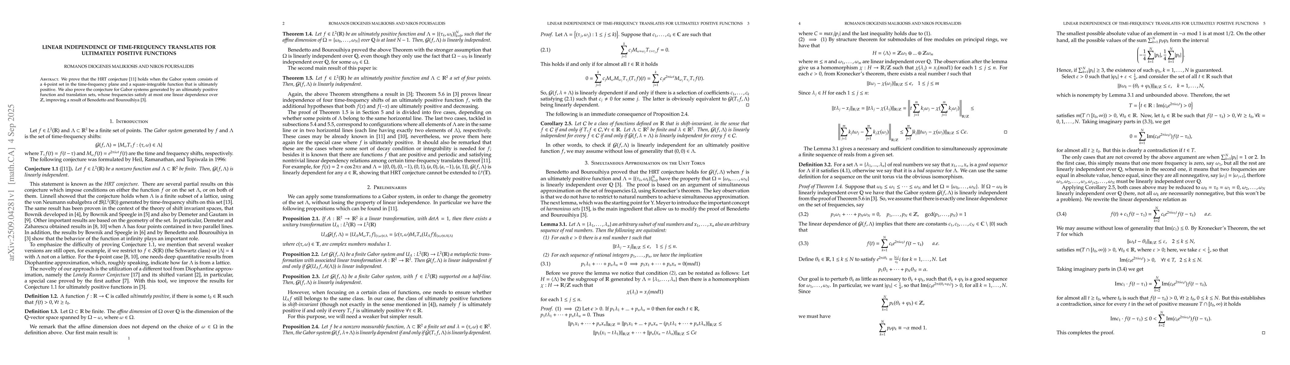 We prove that the HRT conjecture holds when the Gabor system consists of a 4-point set in the time-frequency plane and a square-integrable function that is ultimately positive. We also prove the conjecture for Gabor systems generated by an ultimately positive function and translation sets, whose frequencies satisfy at most one linear dependence over $\mathbb{Z}$, improving a result of Benedetto and Bourouihiya.