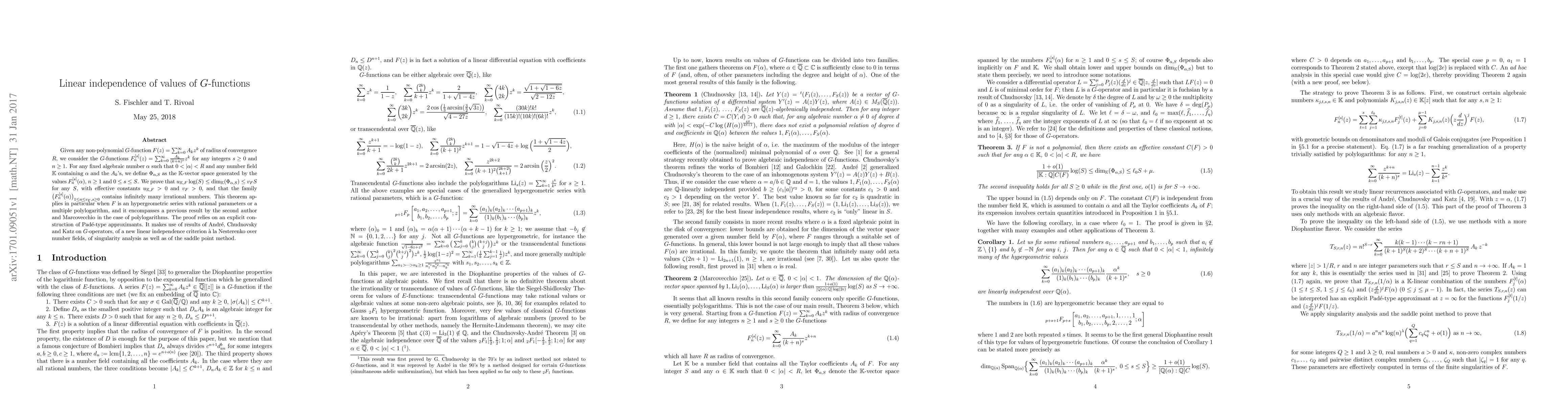 The paper proves that a specific family of G-functions contains infinitely many irrational numbers, with bounds on the dimension of their generated vector space.