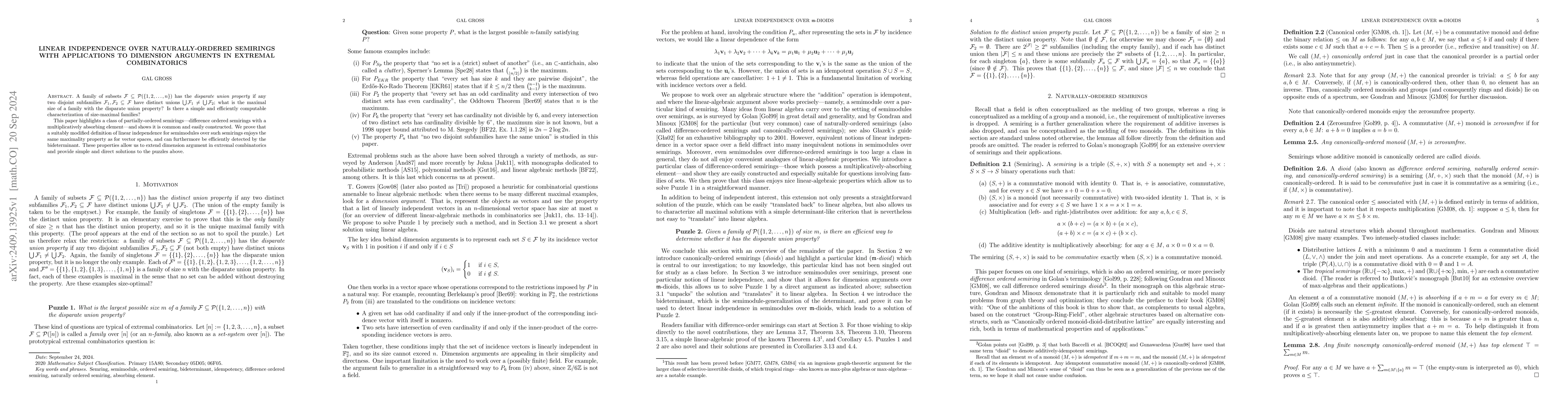 A family of subsets $\mathcal{F} \subseteq \mathcal{P}(\{1, 2, \ldots, n\})$ has the disparate union property if any two disjoint subfamilies $\mathcal{F}_1, \mathcal{F}_2 \subseteq \mathcal{F}$ have distinct unions $\bigcup \mathcal{F}_1 \neq \bigcup \mathcal{F}_2$; what is the maximal size of a family with the disparate union property? Is there a simple and efficiently computable characterization of size-maximal families? This paper highlights a class of partially-ordered semirings -- difference ordered semirings with a multiplicatively absorbing element -- and shows it is common and easily constructed. We prove that a suitably modified definition of linear independence for semimodules over such semirings enjoys the same maximality property as for vector spaces, and can furthermore be efficiently detected by the bideterminant. These properties allow us to extend dimension argument in extremal combinatorics and provide simple and direct solutions to the puzzles above.