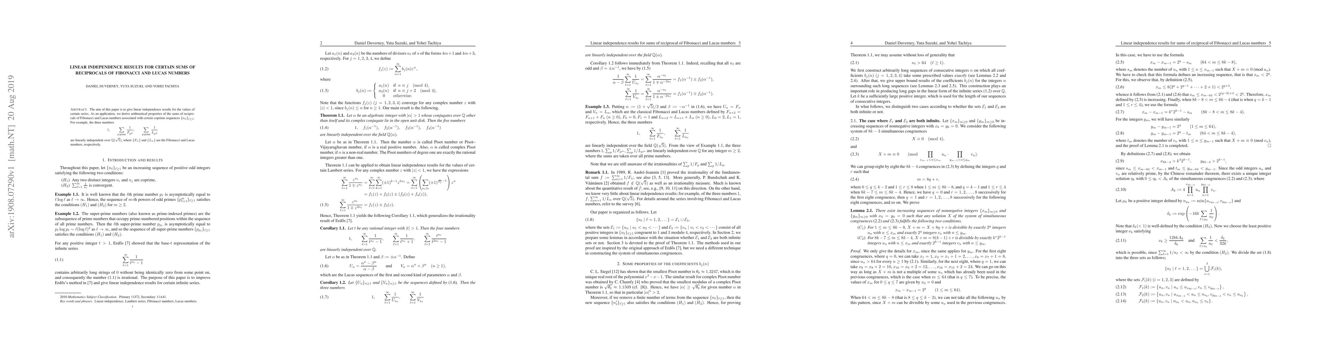 The aim of this paper is to give linear independence results for the values of certain series. As an application, we derive arithmetical properties of the sums of reciprocals of Fibonacci and Lucas numbers associated with certain coprime sequences $\{n_\ell\}_{\ell\geq1}$. For example, the three numbers \[ 1,\qquad\sum_{p\text{:prime}}^{}\frac{1}{F_{p^2}},\qquad\sum_{p\text{:prime}}^{}\frac{1}{L_{p^2}} \] are linearly independent over $\mathbb{Q}(\sqrt{5})$, where $\{F_n\}$ and $\{L_n\}$ are the Fibonacci and Lucas numbers, respectively.