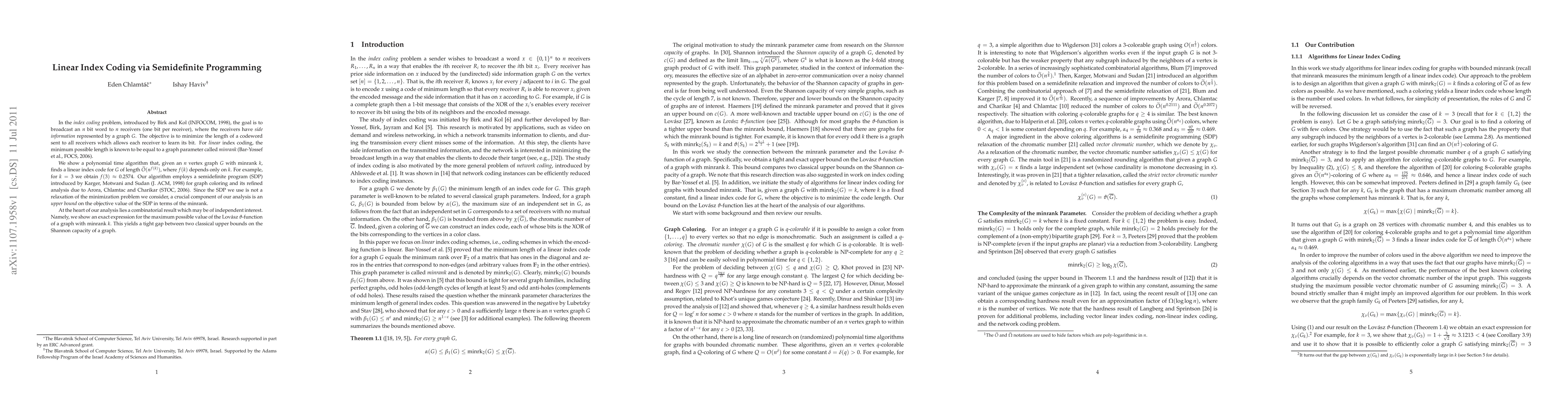In the index coding problem, introduced by Birk and Kol (INFOCOM, 1998), the goal is to broadcast an n bit word to n receivers (one bit per receiver), where the receivers have side information represented by a graph G. The objective is to minimize the length of a codeword sent to all receivers which allows each receiver to learn its bit. For linear index coding, the minimum possible length is known to be equal to a graph parameter called minrank (Bar-Yossef et al., FOCS, 2006). We show a polynomial time algorithm that, given an n vertex graph G with minrank k, finds a linear index code for G of length $\widetilde{O}(n^{f(k)})$, where f(k) depends only on k. For example, for k=3 we obtain f(3) ~ 0.2574. Our algorithm employs a semidefinite program (SDP) introduced by Karger, Motwani and Sudan (J. ACM, 1998) for graph coloring and its refined analysis due to Arora, Chlamtac and Charikar (STOC, 2006). Since the SDP we use is not a relaxation of the minimization problem we consider, a crucial component of our analysis is an upper bound on the objective value of the SDP in terms of the minrank. At the heart of our analysis lies a combinatorial result which may be of independent interest. Namely, we show an exact expression for the maximum possible value of the Lovasz theta-function of a graph with minrank k. This yields a tight gap between two classical upper bounds on the Shannon capacity of a graph.