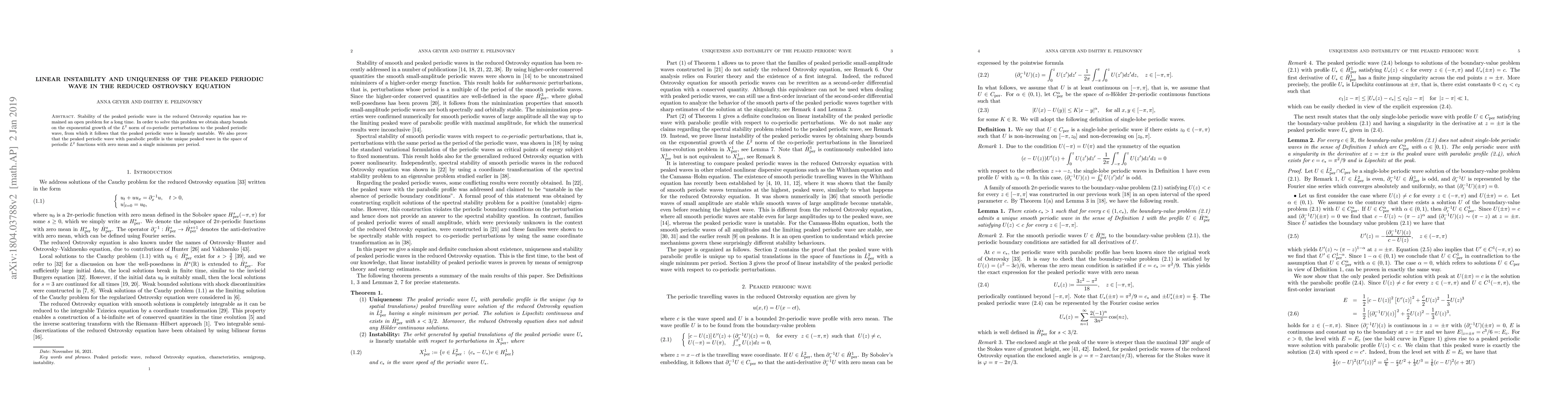 This paper investigates the linear instability of the peaked periodic wave in the reduced Ostrovsky equation, proving it is unstable through sharp bounds on perturbation growth. It also establishes the uniqueness of the parabolic profile for such waves in the periodic $L^2$ function space.