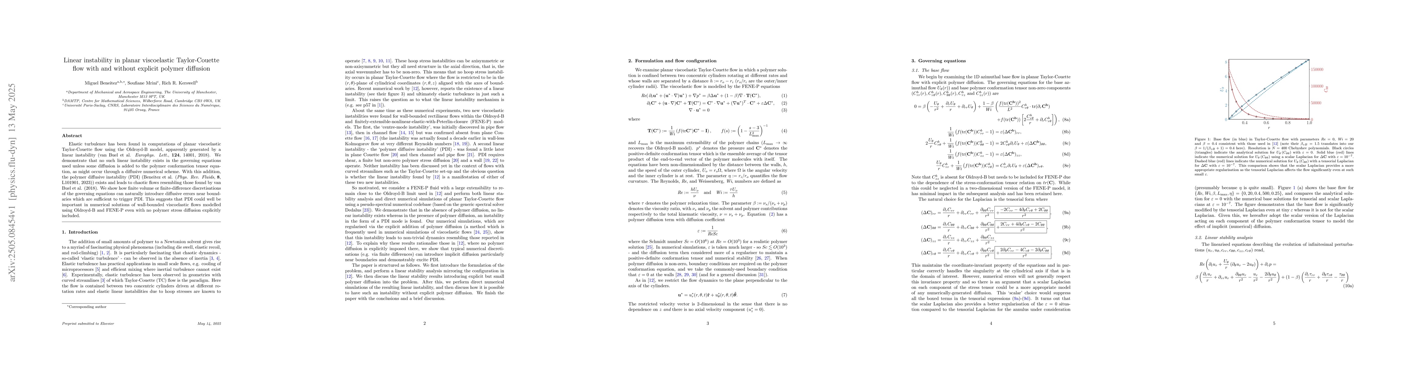 The research investigates planar viscoelastic Taylor-Couette flow using the Oldroyd-B model, examining the role of linear instability and polymer diffusion in generating elastic turbulence.
