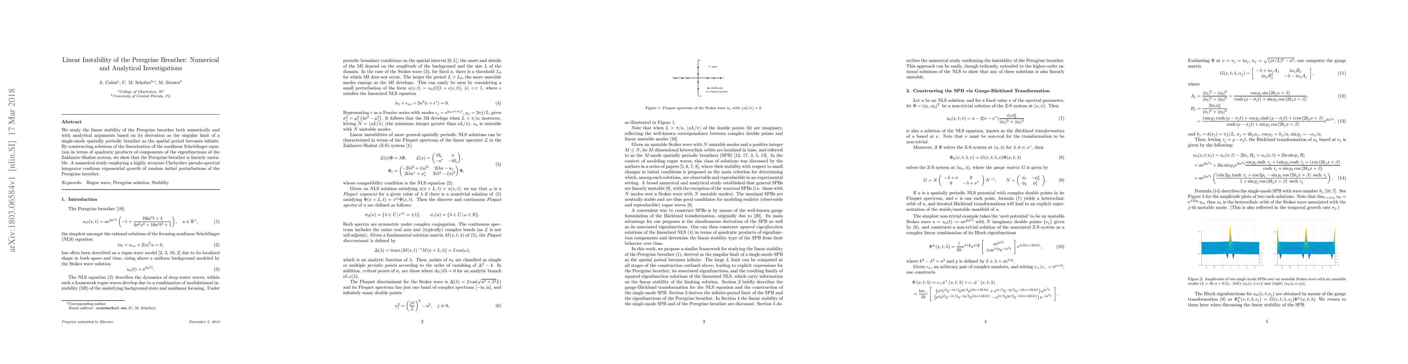 This paper investigates the linear stability of the Peregrine breather using both analytical and numerical methods, demonstrating its linear instability through the construction of solutions based on the Zakharov-Shabat system and confirmed by a highly accurate Chebychev pseudo-spectral integrator. Numerical results show exponential growth of random initial perturbations.