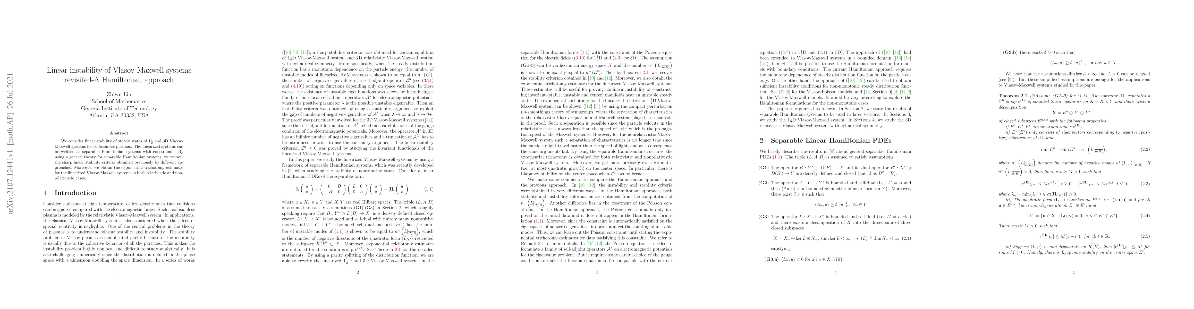 This paper revisits the linear instability of 1D/2D and 3D Vlasov-Maxwell systems using a Hamiltonian approach, confirming previous stability criteria and providing new exponential trichotomy estimates for both relativistic and nonrelativistic cases.
