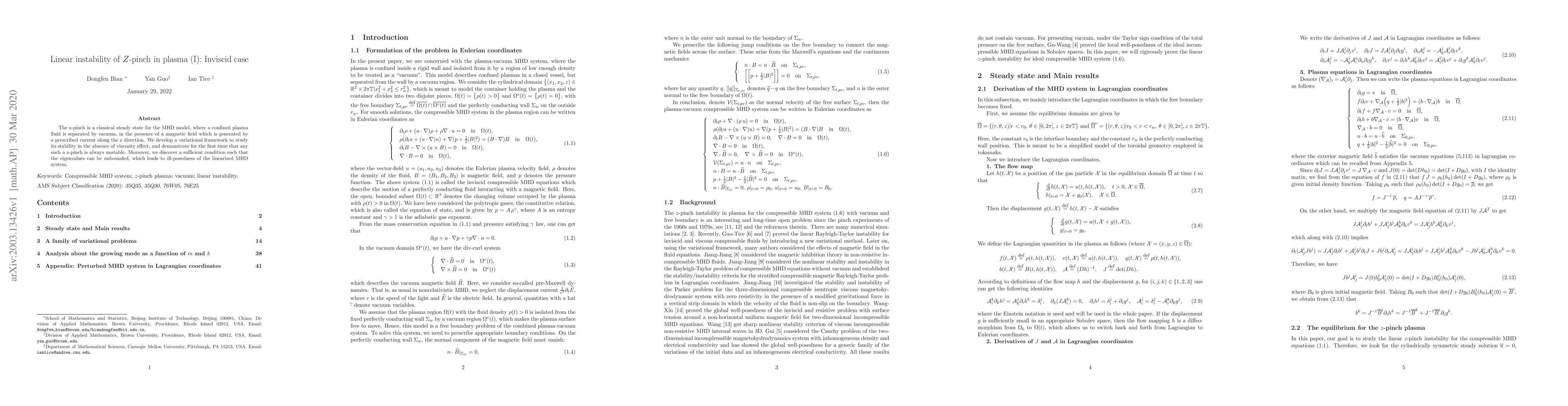 The z-pinch is always unstable in plasma without viscosity, with eigenvalues that can become unbounded, leading to ill-posedness of the linearized MHD system.