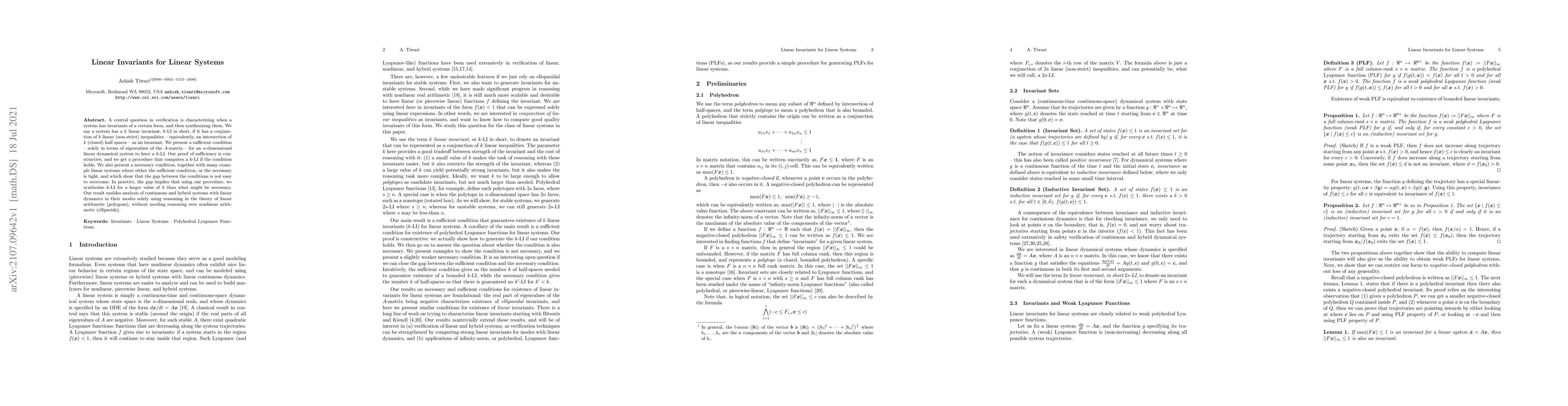 Researchers developed a condition for linear systems to have invariants based on eigenvalues of the A-matrix, enabling analysis using linear arithmetic theory without nonlinear reasoning.