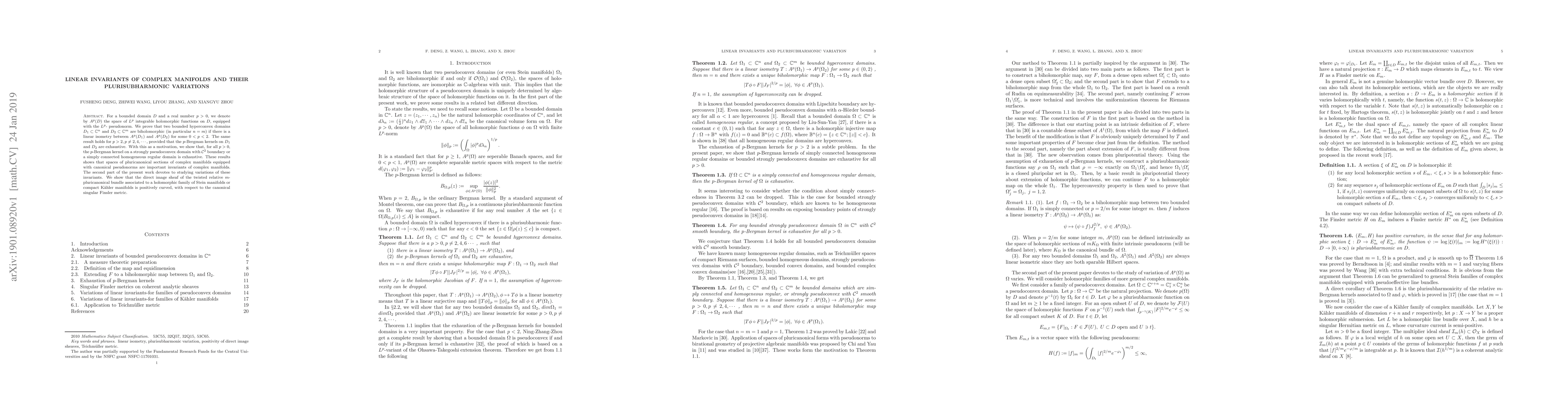 2, p\neq 2,4,\cdots$, provided that the $p$-Bergman kernels on $D_1$ and $D_2$ are exhaustive. With this as a motivation, we show that, for all $p>0$, the $p$-Bergman kernel on a strongly pseudoconvex domain with $\mathcal C^2$ boundary or a simply connected homogeneous regular domain is exhaustive. These results shows that spaces of pluricanonical sections of complex manifolds equipped with canonical pseudonorms are important invariants of complex manifolds. The second part of the present work devotes to studying variations of these invariants. We show that the direct image sheaf of the twisted relative $m$-pluricanonical bundle associated to a holomorphic family of Stein manifolds or compact K\"ahler manifolds is positively curved, with respect to the canonical singular Finsler metric.