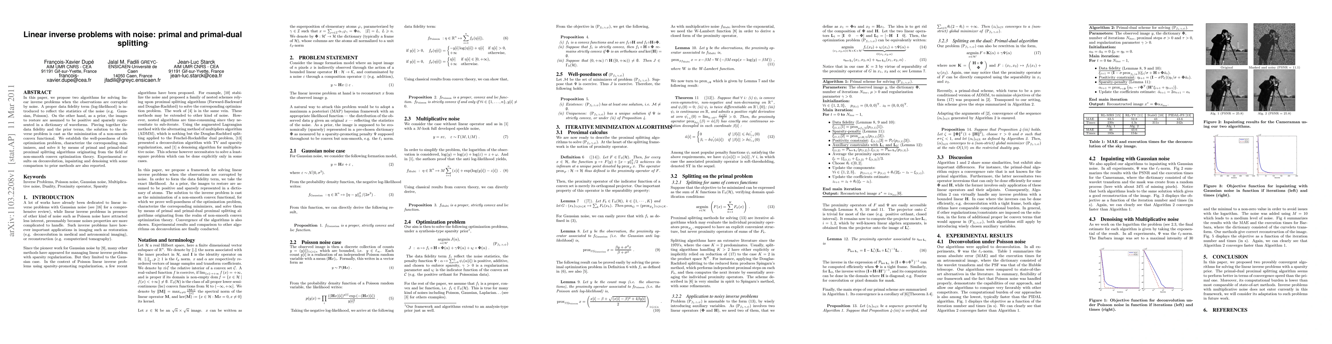 This paper proposes two algorithms—primal and primal-dual proximal splitting—to solve linear inverse problems with noisy observations. It introduces a log-likelihood data fidelity term to account for noise statistics and uses a dictionary-based sparsity prior for image restoration, solving the optimization via non-smooth convex functional minimization.