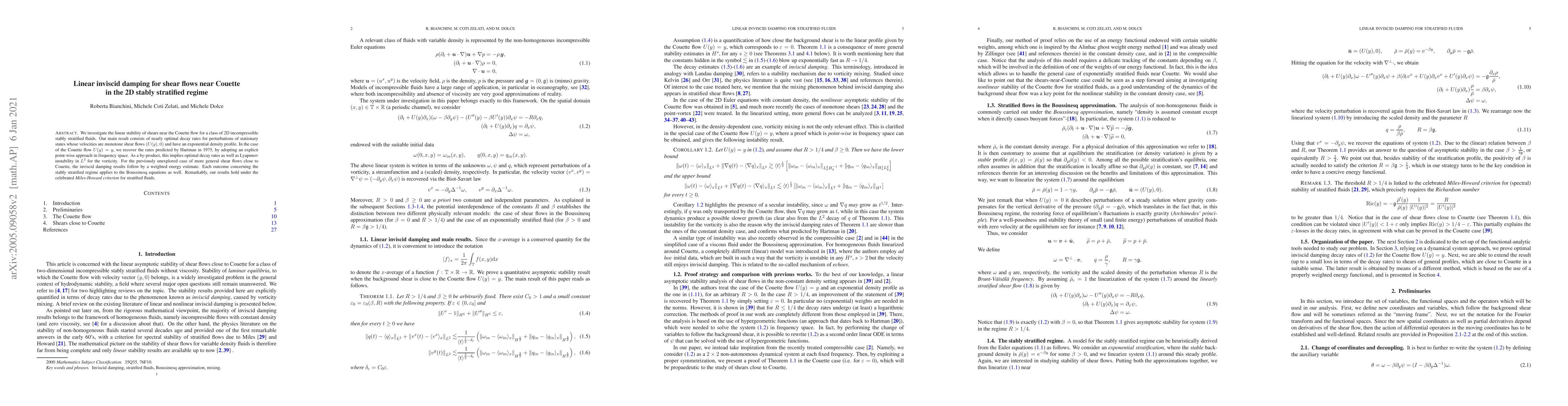 We investigate the linear stability of shears near the Couette flow for a class of 2D incompressible stably stratified fluids. Our main result consists of nearly optimal decay rates for perturbations of stationary states whose velocities are monotone shear flows $(U(y),0)$ and have an exponential density profile. In the case of the Couette flow $U(y)=y$, we recover the rates predicted by Hartman in 1975, by adopting an explicit point-wise approach in frequency space. As a by-product, this implies optimal decay rates as well as Lyapunov instability in $L^2$ for the vorticity. For the previously unexplored case of more general shear flows close to Couette, the inviscid damping results follow by a weighted energy estimate. Each outcome concerning the stably stratified regime applies to the Boussinesq equations as well. Remarkably, our results hold under the celebrated Miles-Howard criterion for stratified fluids.