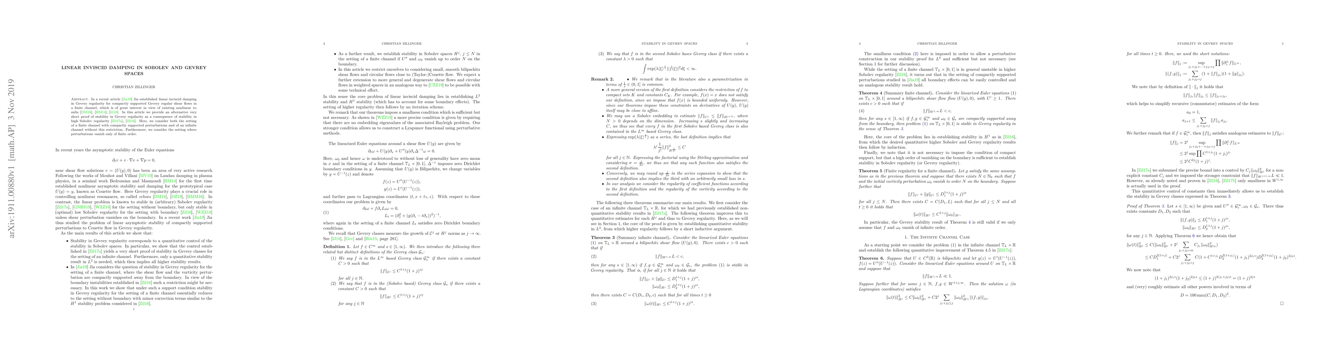 This paper presents a concise proof of linear inviscid damping stability in Gevrey regularity, building on Jia's work, by demonstrating stability in high Sobolev regularity. It examines both finite and infinite channel settings with and without compactly supported perturbations.