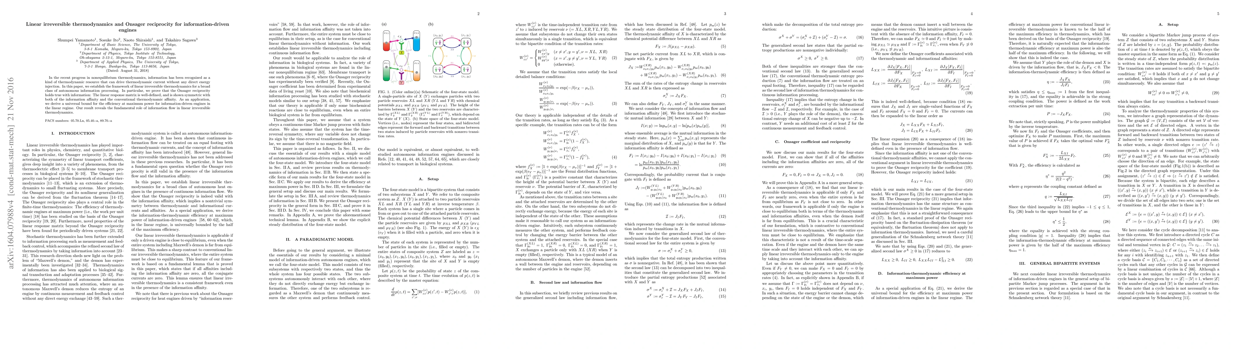 This paper establishes a framework for linear irreversible thermodynamics applicable to autonomous information processing, proving Onsager reciprocity for information. It derives a universal efficiency bound for information-driven engines, highlighting the fundamental role of information flow in thermodynamics and its potential relevance to biological systems.