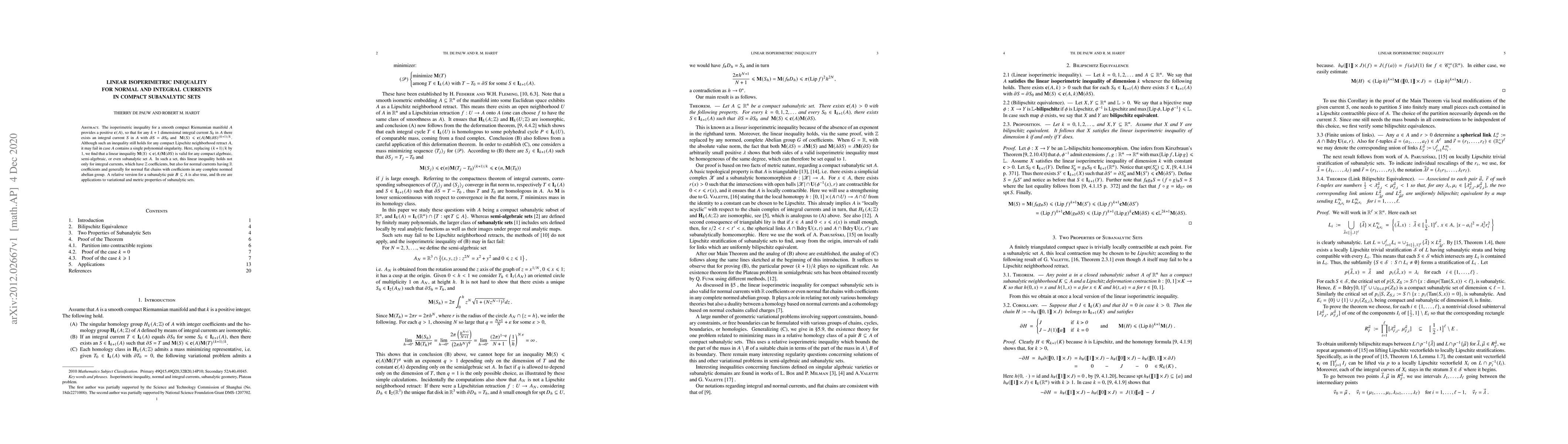 The isoperimetric inequality for a smooth compact Riemannian manifold $A$ provides a positive ${\bf c}(A)$, so that for any $k+1$ dimensional integral current $S_0$ in $A$ there exists an integral current $ S$ in $A$ with $\partial S=\partial S_0$ and ${\bf M}(S)\leq {\bf c}(A){\bf M}(\partial S)^{(k+1)/k}$. Although such an inequality still holds for any compact Lipschitz neighborhood retract $A$, it may fail in case $A$ contains a single polynomial singularity. Here, replacing $(k+1)/k$ by $1$, we find that a linear inequality ${\bf M}(S)\leq {\bf c}(A){\bf M}(\partial S)$ is valid for any compact algebraic, semi-algebraic, or even subanalytic set $A$. In such a set, this linear inequality holds not only for integral currents, which have $\boldsymbol{Z}$ coefficients, but also for normal currents having $\boldsymbol{R}$ coefficients and generally for normal flat chains with coefficients in any complete normed abelian group. A relative version for a subanalytic pair $B\subset A$ is also true, and there are applications to variational and metric properties of subanalytic sets.