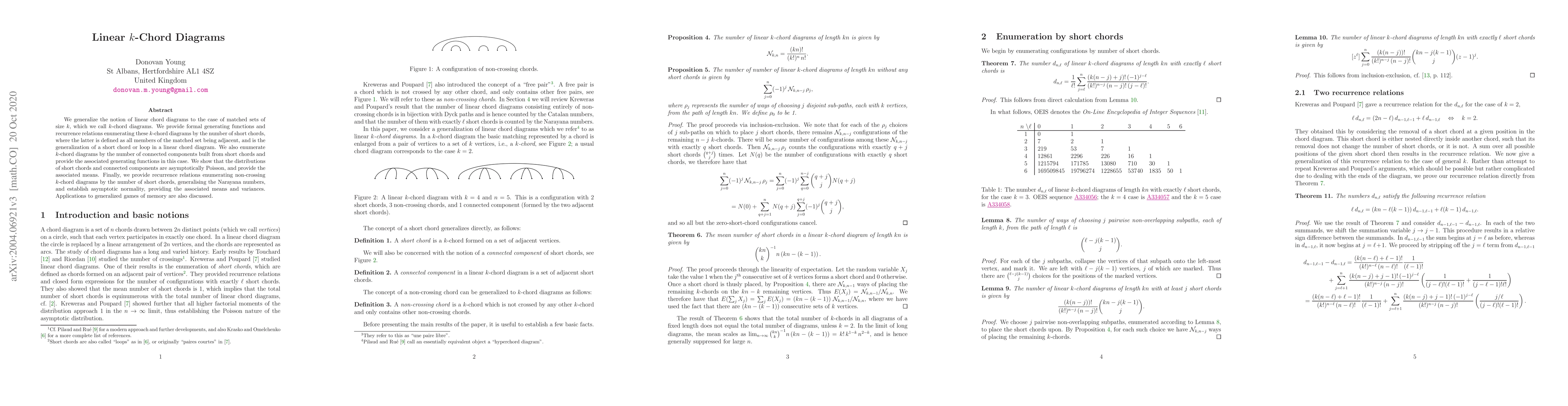 This paper generalizes linear chord diagrams to $k$-chord diagrams for matched sets of size $k$, providing generating functions and recurrence relations for enumerating these diagrams by short chords and connected components. It also discusses asymptotic Poisson distributions and recurrence relations for non-crossing $k$-chord diagrams, along with applications to generalized memory games.