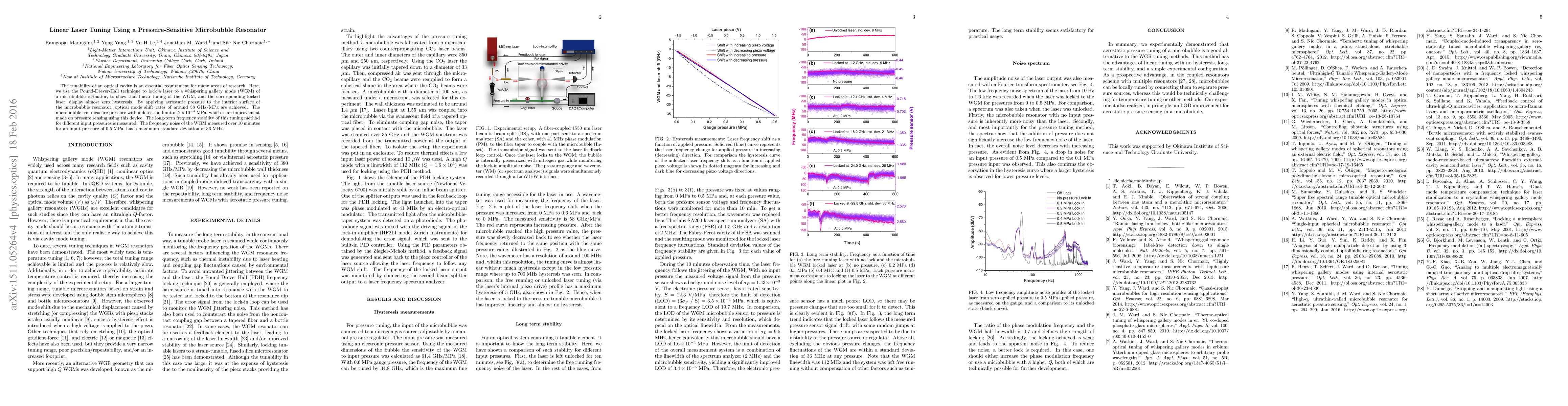 This paper demonstrates a method for linear laser tuning using a pressure-sensitive microbubble resonator, achieving optical mode shift rates of $58$ GHz/MPa and a pressure detection limit of $2\times 10^{-4}$ MPa, with a frequency stability of $36$ MHz over $10$ minutes.