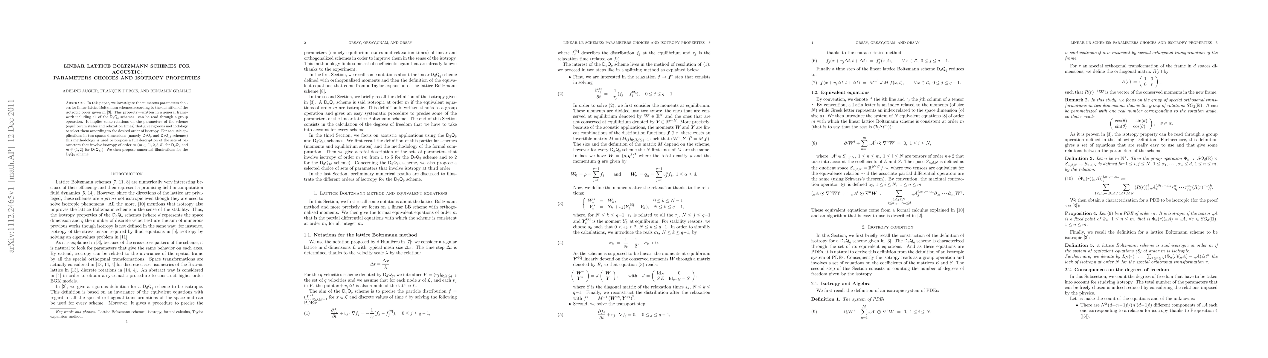 In this paper, we investigate the numerous parameters choices for linear lattice Boltzmann schemes according to the definition of the isotropic order given in \cite{ADG11}. This property---written in a general framework including all of the \ddqq schemes---can be read through a group operation. It implies some relations on the parameters of the scheme (equilibrium states and relaxation times) that give rigorous methodology to select them according to the desired order of isotropy. For acoustic applications in two spaces dimensions (namely \ddqn and \ddqt schemes) this methodology is used to propose a full description of the sets of parameters that involve isotropy of order $m$ ($m\in\{1,2,3,5\}$ for \ddqn and $m\in\{1,2\}$ for \ddqt). We then propose numerical illustrations for the \ddqn scheme.
