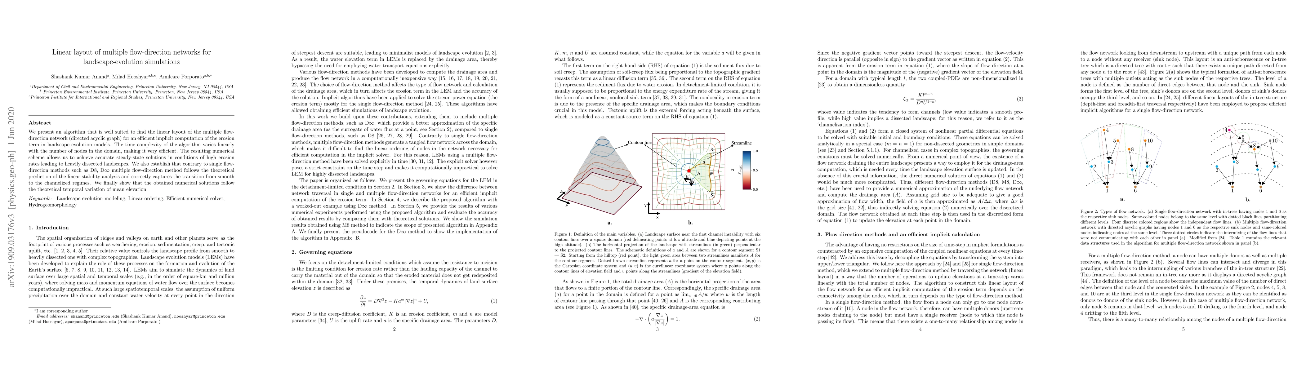 We present an algorithm that is well suited to find the linear layout of the multiple flow-direction network (directed acyclic graph) for an efficient implicit computation of the erosion term in landscape evolution models. The time complexity of the algorithm varies linearly with the number of nodes in the domain, making it very efficient. The resulting numerical scheme allows us to achieve accurate steady-state solutions in conditions of high erosion rates leading to heavily dissected landscapes. We also establish that contrary to single flow-direction methods such as D8, D$\infty$ multiple flow-direction method follows the theoretical prediction of the linear stability analysis and correctly captures the transition from smooth to the channelized regimes. We finally show that the obtained numerical solutions follow the theoretical temporal variation of mean elevation.