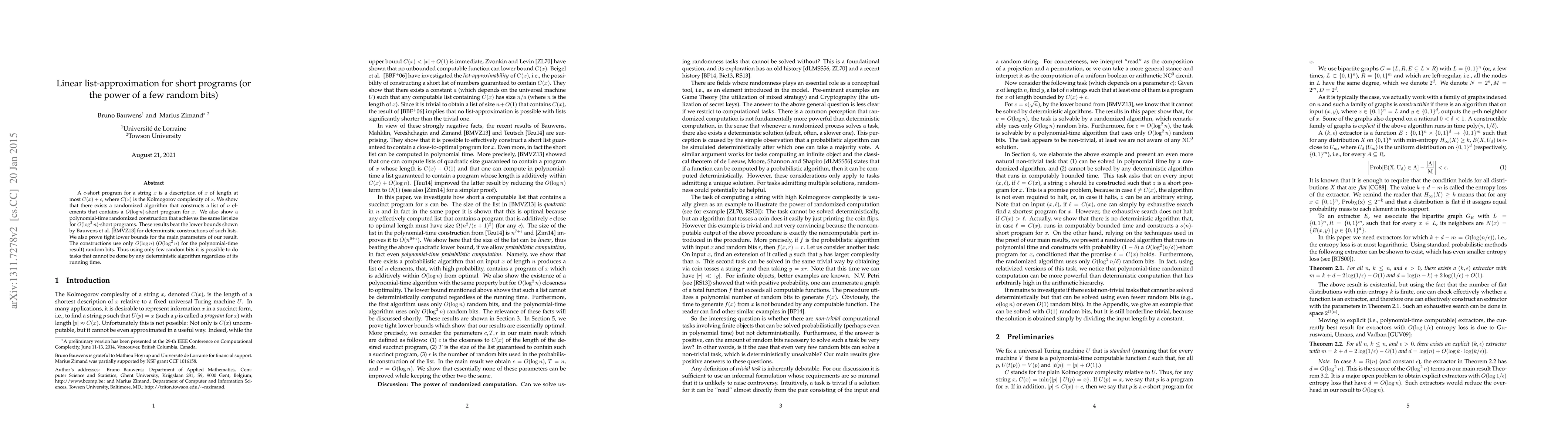 This research introduces a randomized algorithm that generates a list containing a O(log n)-short program for any string x, using only O(log n) random bits. It also presents a polynomial-time randomized method for creating a list with O(log^2 n)-short programs, surpassing previous deterministic construction bounds. The findings highlight the efficiency of randomized methods with minimal random bits for tasks unattainable deterministically, despite ample time.
