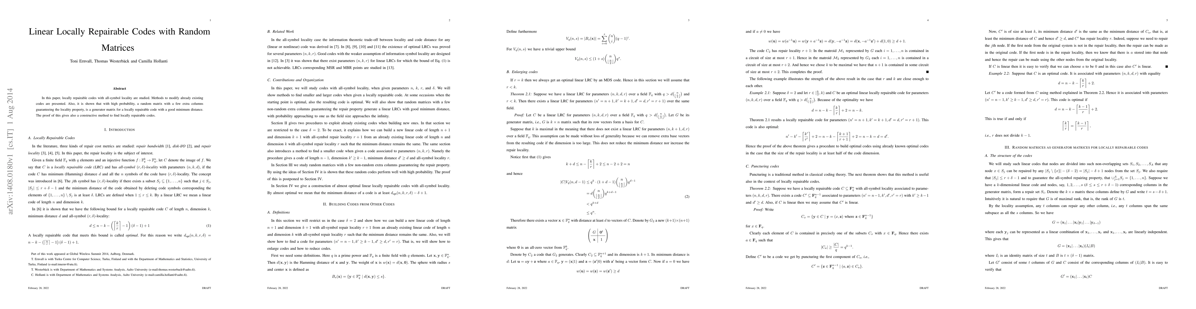 In this paper, locally repairable codes with all-symbol locality are studied. Methods to modify already existing codes are presented. Also, it is shown that with high probability, a random matrix with a few extra columns guaranteeing the locality property, is a generator matrix for a locally repairable code with a good minimum distance. The proof of this gives also a constructive method to find locally repairable codes.