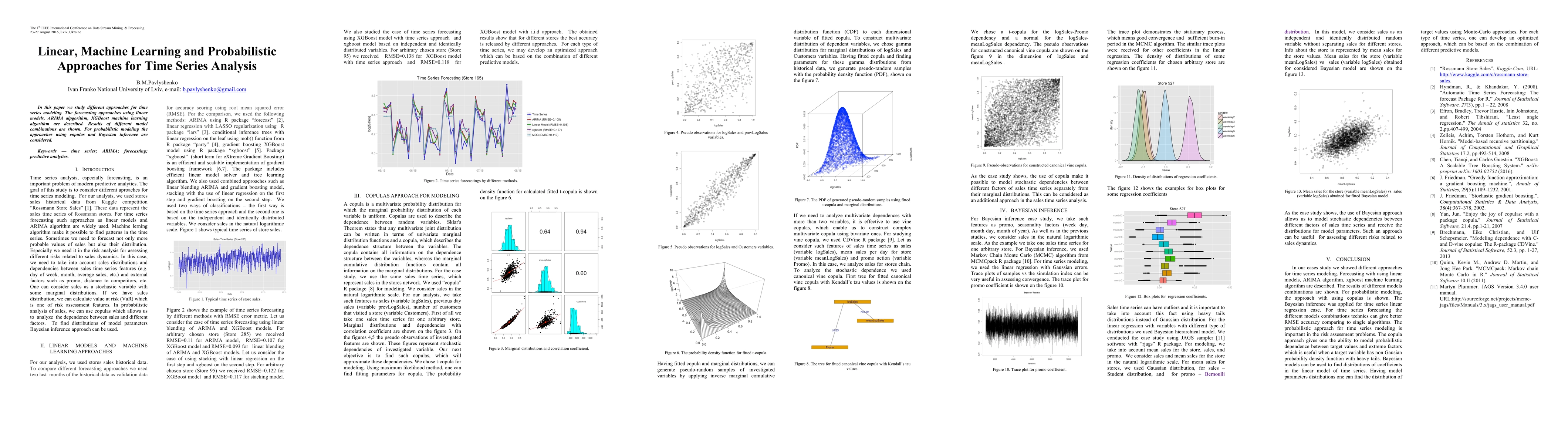 This paper explores various methods for time series modeling, including linear models, ARIMA, and the XGBoost machine learning algorithm, alongside probabilistic techniques using copulas and Bayesian inference, presenting results from different model combinations.