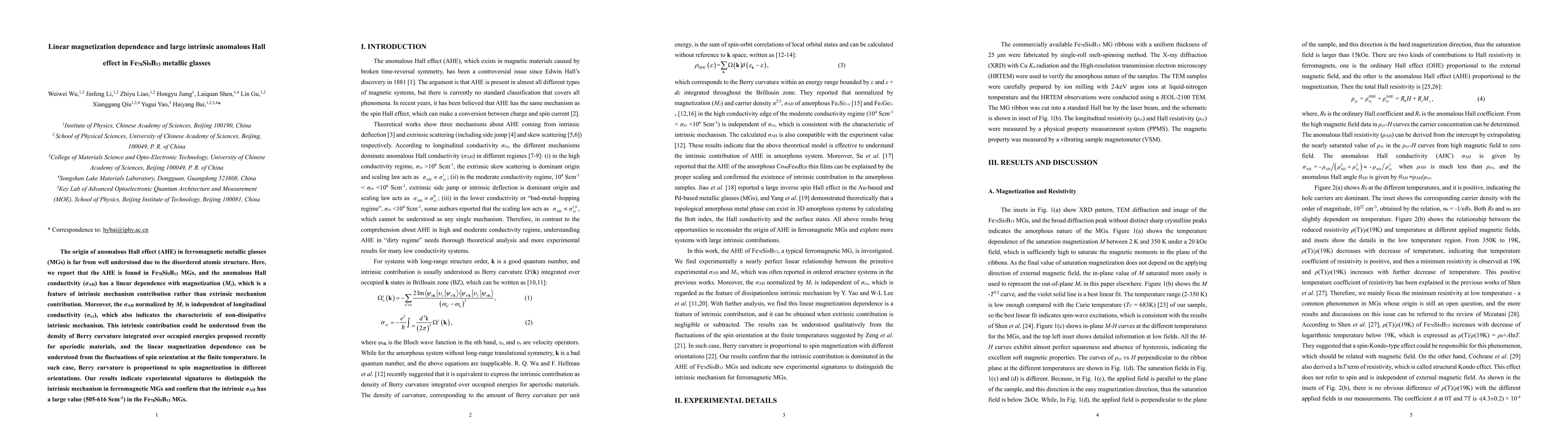 This paper investigates the anomalous Hall effect (AHE) in Fe78Si9B13 metallic glasses, finding a linear magnetization dependence and large intrinsic AHE, suggesting a dissipationless intrinsic mechanism driven by Berry curvature and hinting at topological properties.