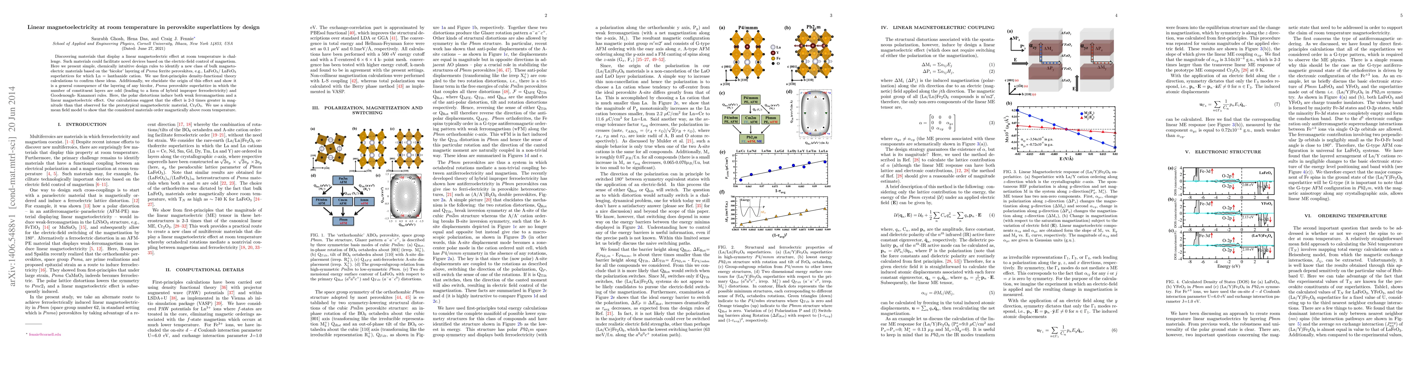 Discovering materials that display a linear magnetoelectric effect at room temperature is challenge. Such materials could facilitate novel devices based on the electric-field control of magnetism. Here we present simple, chemically intuitive design rules to identify a new class of bulk magnetoelectric materials based on the 'bicolor' layering of $Pnma$ ferrite perovskites, e.g., LaFeO$_3$/ LnFeO$_3$ superlattices for which Ln = lanthanide cation. We use first-principles density-functional theory calculations to confirm these ideas. Additionally, we elucidate the origin of this effect and show it is a general consequence of the layering of any bicolor, $Pnma$ perovskite superlattice in which the number of constituent layers are odd (leading to a form of hybrid improper ferroelectricity) and Goodenough- Kanamori rules. Here, the polar distortions induce both weak ferromagnetism and a linear magnetoelectric effect. Our calculations suggest that the effect is 2-3 times greater in magnitude than that observed for the prototypical magnetoelectric material, Cr$_2$O$_3$. We use a simple mean field model to show that the considered materials order magnetically above room temperature.